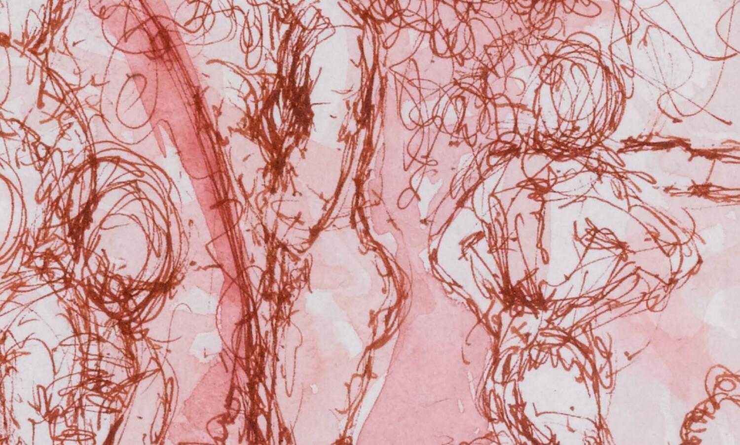 Multiple bodies, perspectives and lines evoke a dream-like sense where dramatic form inhabits a nonspecific space. There is a balance within the work between the lessening of detail of features against the definite curves of the body.