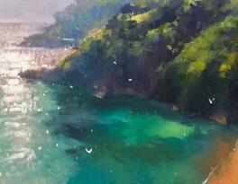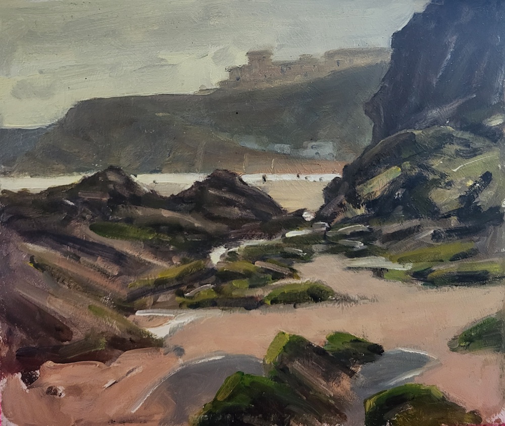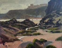 Christopher Slater ARSMA will work from a small plein air painting of a Cornish beach (10 x 12 ins), enlarging it to 20 x 24 inches and incorporating figures in oils.