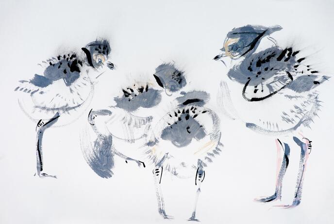 Alongside practising as an artist, Wynona works full time for the RSPB, leading a project protecting beach nesting birds at Snettisham in North Norfolk. Her observations as both an artist and a conservationist have given her an intimate understanding of the lives of Ringed Plover and the tensions and impacts of beach recreation on their lives.