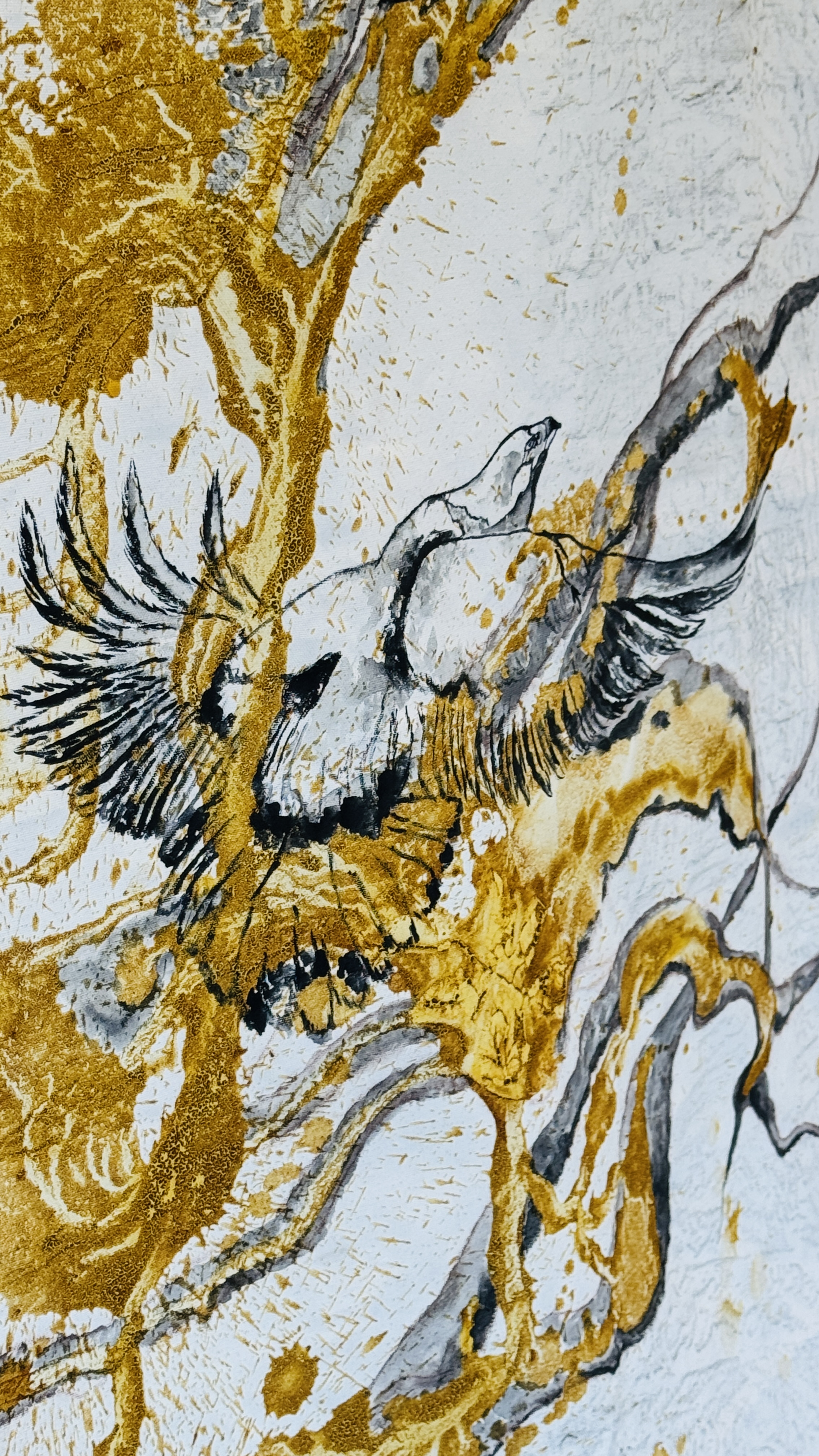 Rooted in mysticism and painted with materials drawn directly from nature, Jaffer’s work echoes the whispering voice of the soul—fragile yet persistent, like the flutter of wings on wind. Here, the birds do not just travel across deserts and valleys; they traverse the vast inner landscapes of self-doubt, attachment, fear, and awakening. Each piece speaks to the silence beneath sound, the stillness beneath chaos—the whispers that guide us if we are willing to listen.
