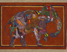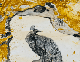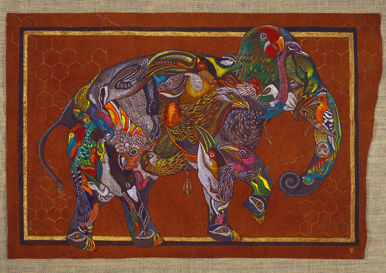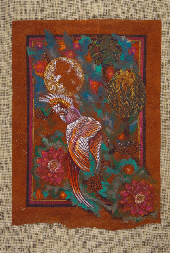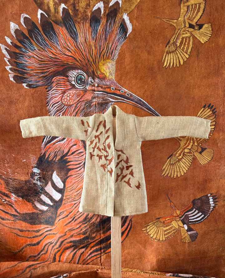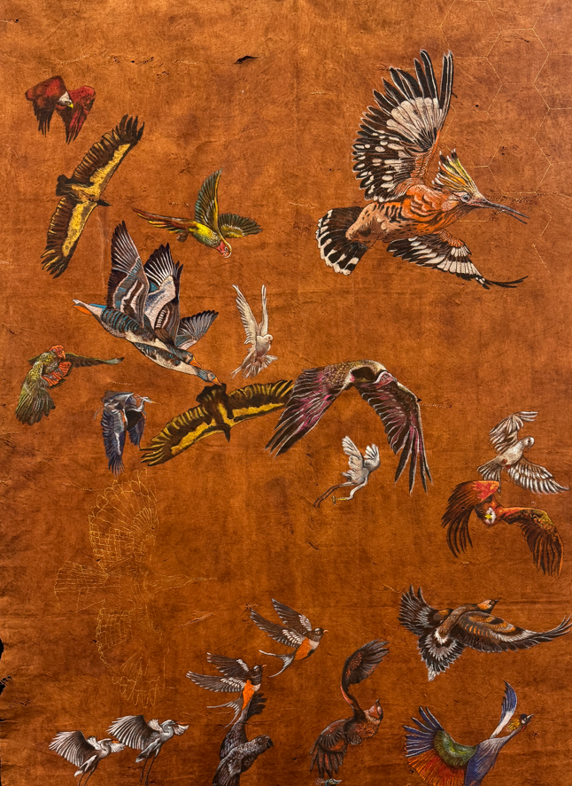 The Hoopoe, once again, leads the way in these new works. With quiet authority, she calls each bird to undertake the journey through the seven valleys: Quest, Love, Knowledge, Detachment, Unity, Wonder, and finally, Annihilation of the Self. These valleys are not geographic—they are symbolic thresholds of transformation. In one painting, the Peacock gazes into its reflection, blinded by vanity; in another, the Finch trembles on a branch of uncertainty. The imagery is rich in metaphor, yet grounded in the tangible textures of natural material.