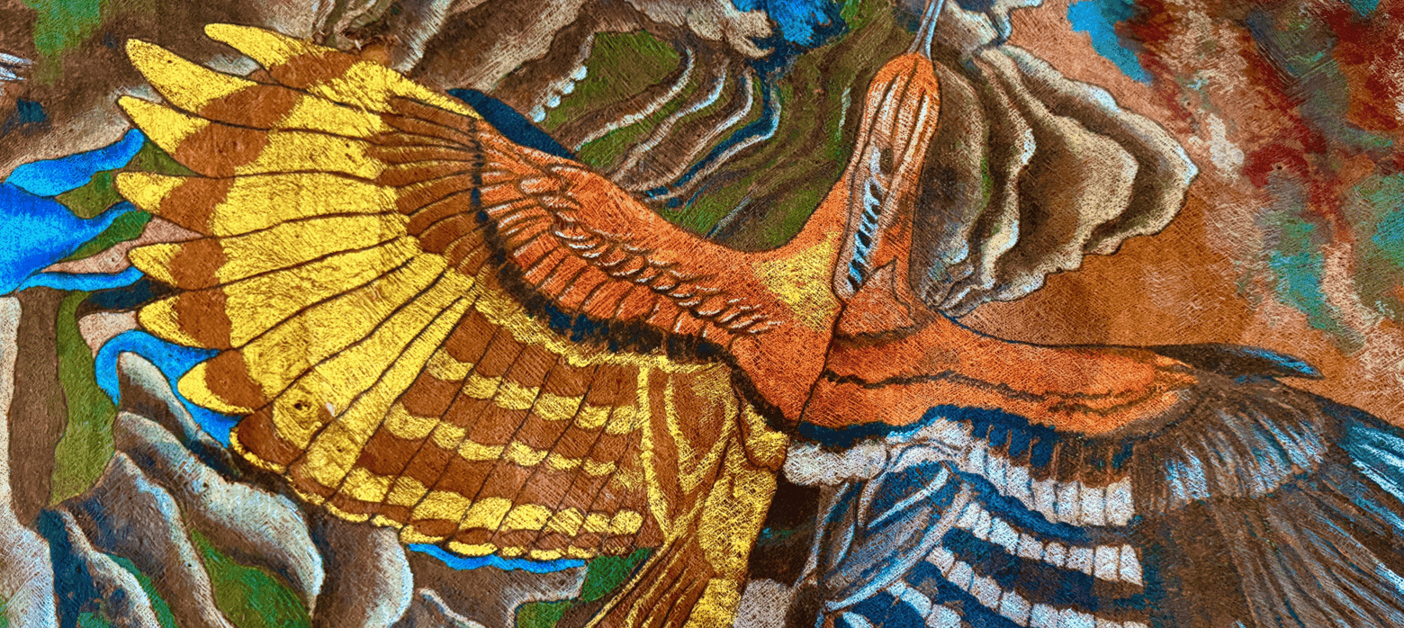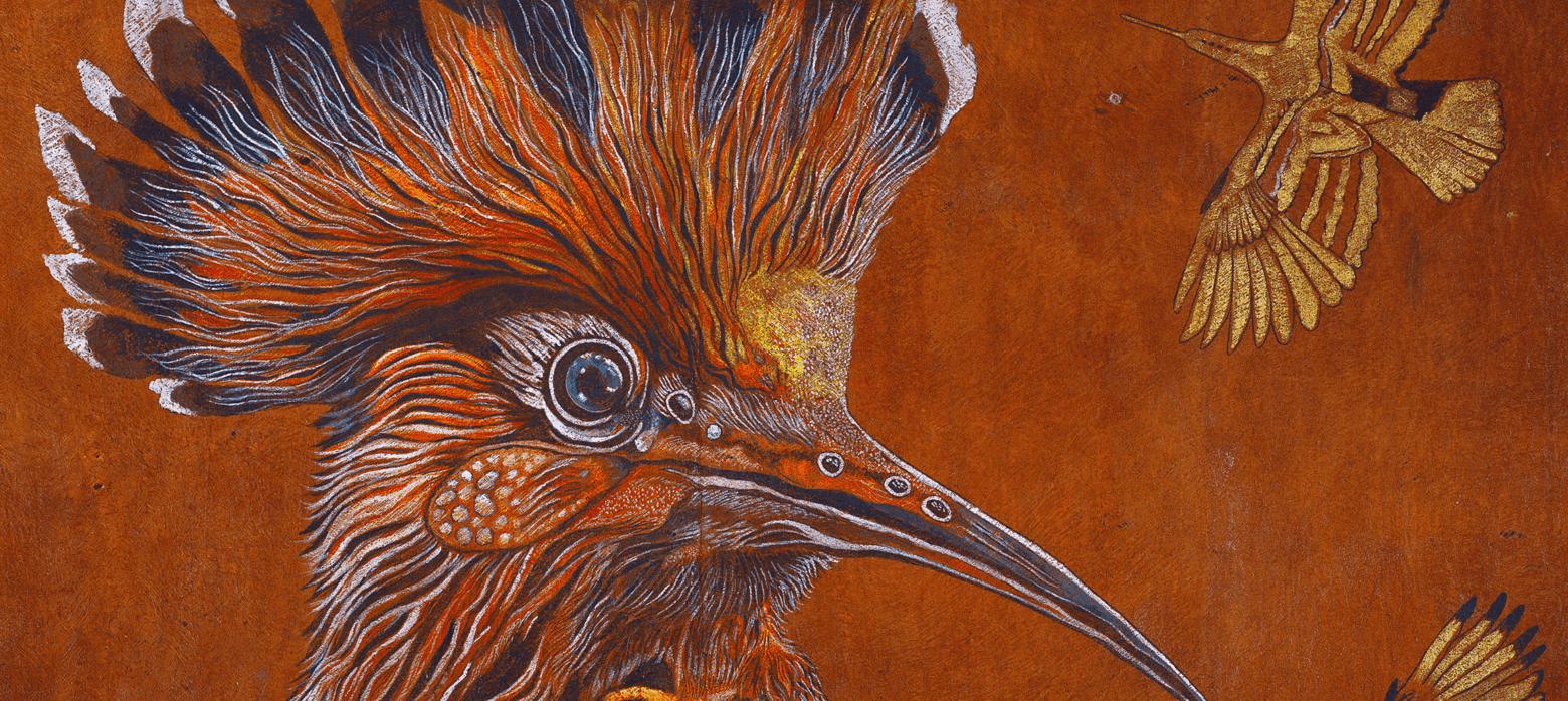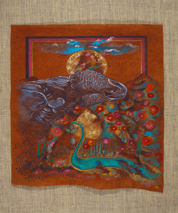 Painted on sustainably sourced bark cloth from the forests surrounding Lake Victoria, Tanzania and using pigments ground from minerals, earth, and crystal, Jaffer’s work is not only spiritual but materially aligned with the ecological urgency of our times. Her paintings often feature endangered African birds—reminders of both biodiversity under threat and voices long ignored. In this exhibition, these birds take on a sacred presence: not simply seekers of a mythical king, but messengers from a world in peril.