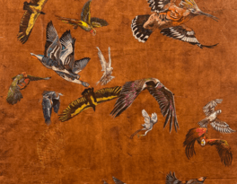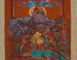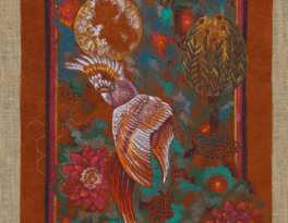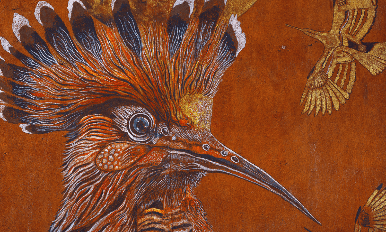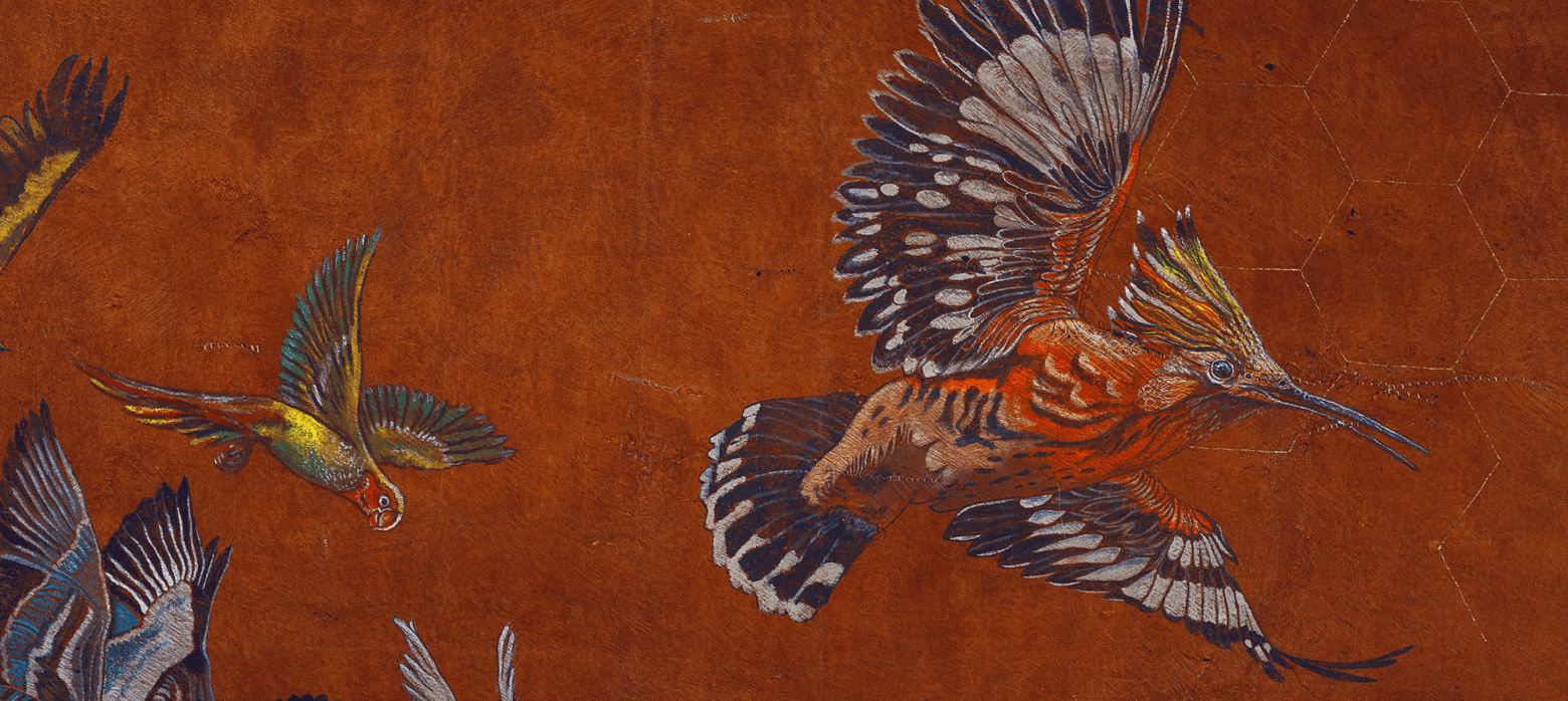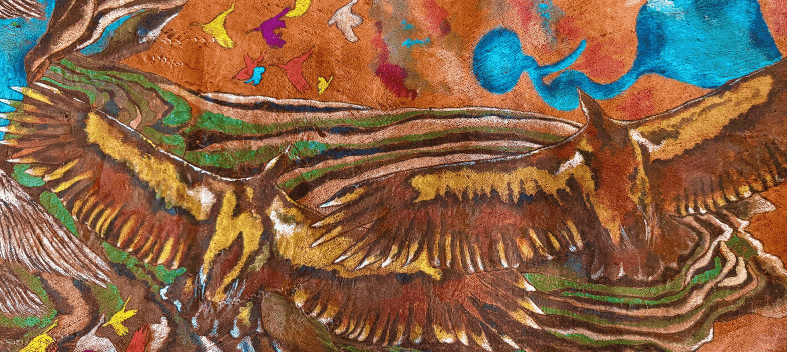 Painted on sustainably sourced bark cloth from the forests surrounding Lake Victoria, Tanzania and using pigments ground from minerals, earth, and crystal, Jaffer’s work is not only spiritual but materially aligned with the ecological urgency of our times. Her paintings often feature endangered African birds—reminders of both biodiversity under threat and voices long ignored. In this exhibition, these birds take on a sacred presence: not simply seekers of a mythical king, but messengers from a world in peril.