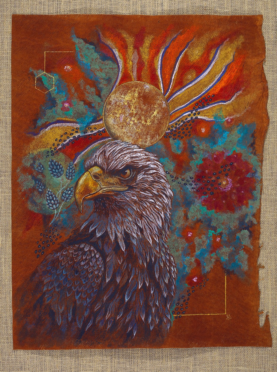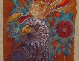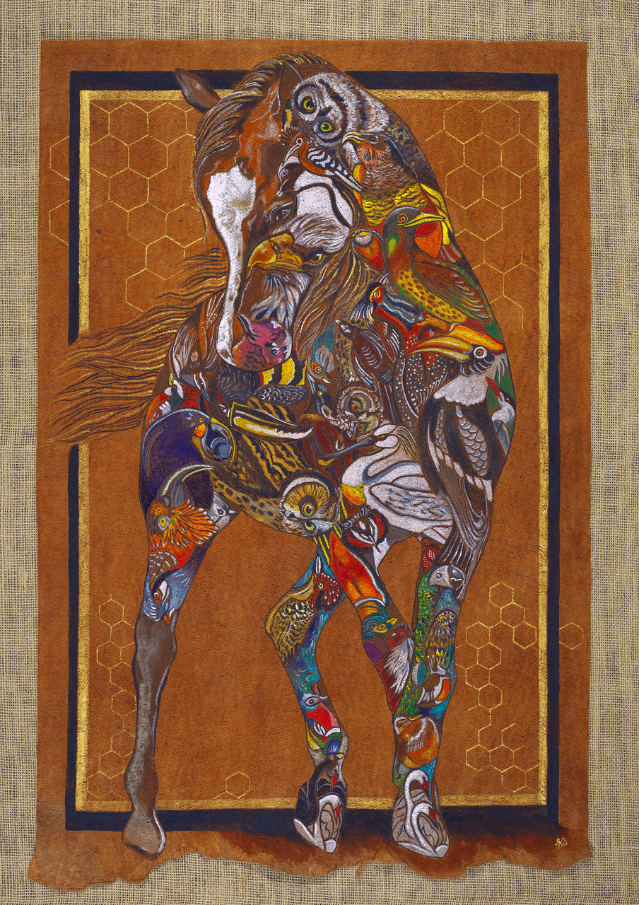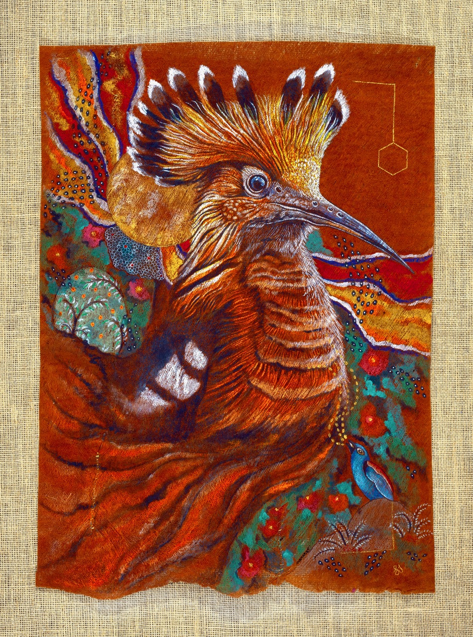 The Hoopoe, once again, leads the way in these new works. With quiet authority, she calls each bird to undertake the journey through the seven valleys: Quest, Love, Knowledge, Detachment, Unity, Wonder, and finally, Annihilation of the Self. These valleys are not geographic—they are symbolic thresholds of transformation. In one painting, the Peacock gazes into its reflection, blinded by vanity; in another, the Finch trembles on a branch of uncertainty. The imagery is rich in metaphor, yet grounded in the tangible textures of natural material.