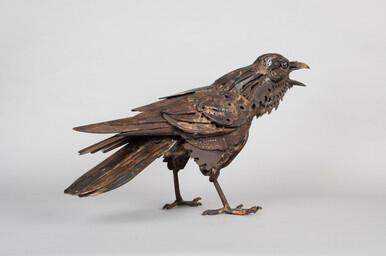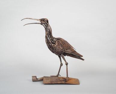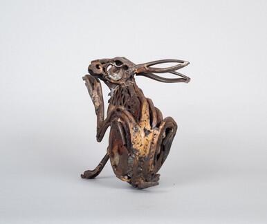Harriet creates her work by welding steel objects together. It is a method and material that she loves due to its strength and adaptability, allowing her to produce work that balances on tiny points of contact. She enjoys the juxtaposition of old tools and discarded items that combine to make a ‘living’ creature and suggest the muscles and contours of the subject. Harriet scavenges from farm yards and sheds and has a wonderful team of friends and enthusiasts who squirrel things away for her. Each item has a former life and in many cases is worn from years of use. She likes to think that she is making natural history from agricultural history.