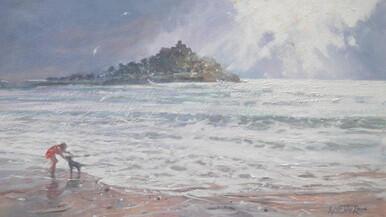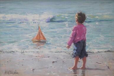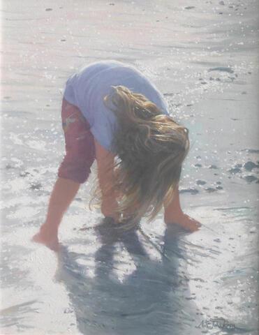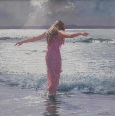 Though Nicholas St John Rosse paints a wide range of subject matter, most of his paintings are centered around the human figure and in recent years use beach settings, in particular at the water's edge. He likes to find ways in which the figure can relate to water and sand both in reality and pictorially. The visual fusion of water, sand and rock enveloping people fascinates him, and he tries to use these elements as an extension of the model's mood.