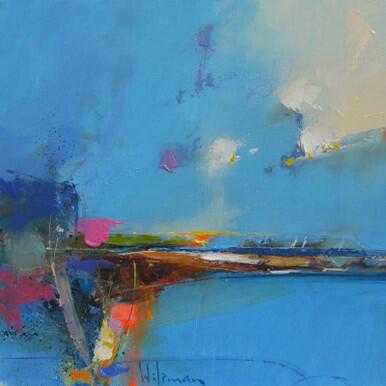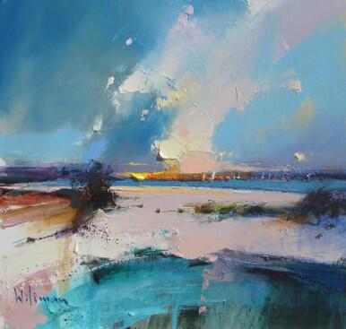 Peter has always been attracted to coasts and seascapes in general, as he loves the sense of infinity and endless searching that they give him. The subject of his next work will usually come to Peter when he is out by the sea, feeling at one with the nature and its elements, and at this time he knows what direction the composition will take. Back in his studio the painting begins to take shape in reality, and he aims to recreate both what she has seen and his own emotional response to it. Peter prefers to paint in oils as he finds that this is the medium most adaptable to changes of light and mood.