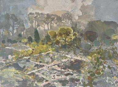 A limited pallette gives an impression of the subtlety of nature, a cluster of almost indistinguishable greys punctuated with the cadmium of a leaf, transparent in the evening glare.