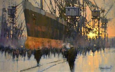 Coming from a graphic arts background, Tony looks for design lead subjects which also lend to atmosphere. This philosophy results in many varied subjects found near his North Devon home, or further afield with composite dockland subjects, often inspired by black and white photographs he took in London in the 1960’s being a particular love. These are the pictures with large slabs of plain painting set against knots of detailed warps, chains, crane steelwork and cables which often interrupt a setting sun or rising moon. There is often room for a small distant atmospheric painting within the picture. Working from a pochade sketch, pencil drawings and back up photographs, his painting is predominantly studio worked, sometimes alla prima, other times, dried between stages of further painting. Main areas of interest are Rural landscape, bullocks and cows, horses being shod, Marine subjects and surfaces beneath water.