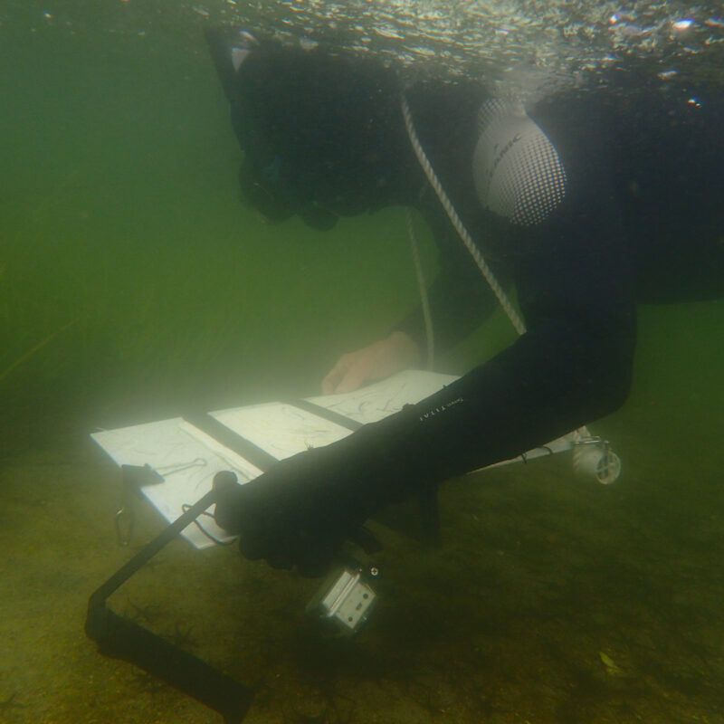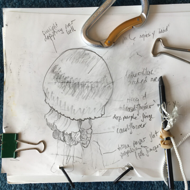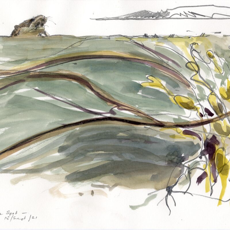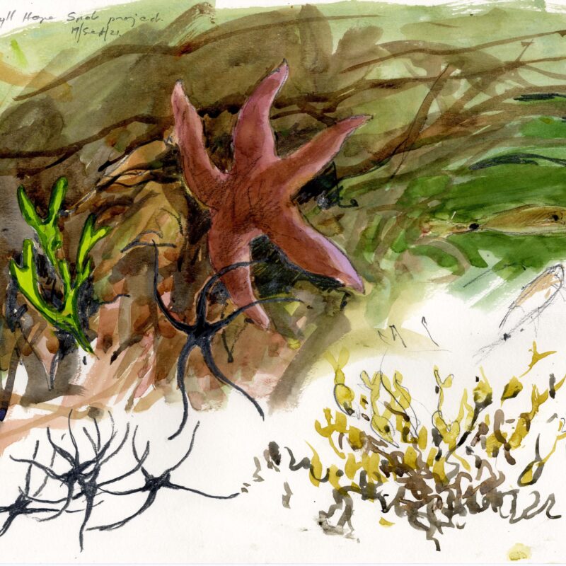 Many of our members have experience of drawing underwater, thanks to diving bursaries provided by the Wildlife Trusts. In July and September this year, two groups of artists visited Argyll. They were overwhelmed by the variety of marine life that they encountered, but also by the scale of the task. All the normal rules of fieldwork were turned upside down, sometimes quite literally. Even before entering the water, they struggled, pulling on multiple layers of neoprene. Once submerged they experimented with weight belts to keep themselves stable and learned how to stop their masks from steaming up. They practised the best way to carry a drawing board whilst leaving hands free for swimming, how to stop pencils floating away and how to prevent paper disintegrating in the water.