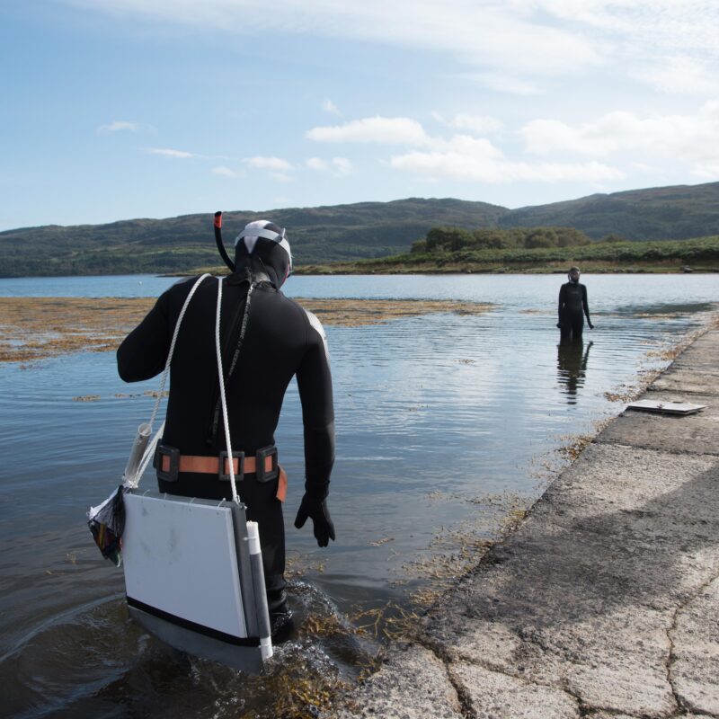 "I was lucky enough to be part of the first group of artists to visit the Argyll coast as part of the project. It was an amazing experience to dip your head beneath the surface and be met by an extraordinary burst of colour and texture. The underwater landscape led from rock and sand at the shore to the majesty of the kelp forests and the serenity of the eelgrass meadows with 'flocks' of brittle stars. It was an exhilarating experience and even though the wetsuit was a trial to get on I could not wait to get into the water and was reluctant to get out. My last time in the water was late in the day. I had borrowed Hans the boatbuilder's workshop and had managed to make a wrasse sculpture. I knew the other artists were planning a final trip to The Rapids but I thought I was too late to join them after a long day welding. Luckily I managed to tag along.