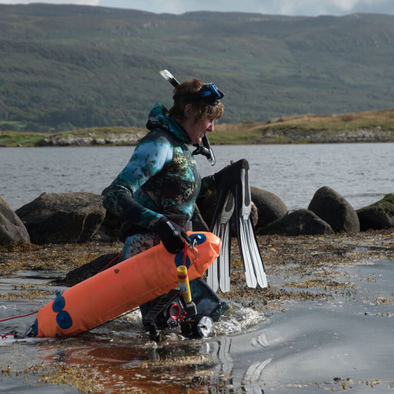 The current was quite strong as the tide was going out so Chris Rose and I buddied up to 'ride' the tide along the narrow sheltered neck of the sea loch. It really felt like flying as we were pulled along the strait, skimming above the different weeds and catching glimpses of wildlife in the 'valleys' between the forests. I kept popping my head up to check how far we had gone and suddenly I saw a face up ahead. For a moment I thought it was one of the other snorkelers but realised it was a common seal! I was far too excited and yelped to Chris, pointing to where it had been. We dipped back underwater and for a few magical seconds, the silvered almost luminescent shape of the seal turned right across in front of us. Magical!" - President, Harriet Mead