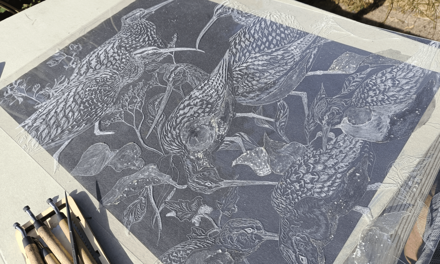 At some point 15 years ago, I felt a desire to learn a new technique. Back then I was still kind of trapped in an ambition to paint detailed bird portraits, but I was bored by the preciseness of small single feathers on the back of Red Knots, Little Stints and all the other waders passing by. I always enjoyed watching my grandfather working in his workshop with wood and different tools. He was a carpenter. The craftsmanship itself fascinated me somehow, but I had no knowledge about such things - and I still haven't, really. But the way of working with an old-school press and the processes and magic connected to the wisdom of printmaking lit my fire. The perfect combination of creativity and craftsmanship where you can always learn more about both the technical side and how to create unique motifs.