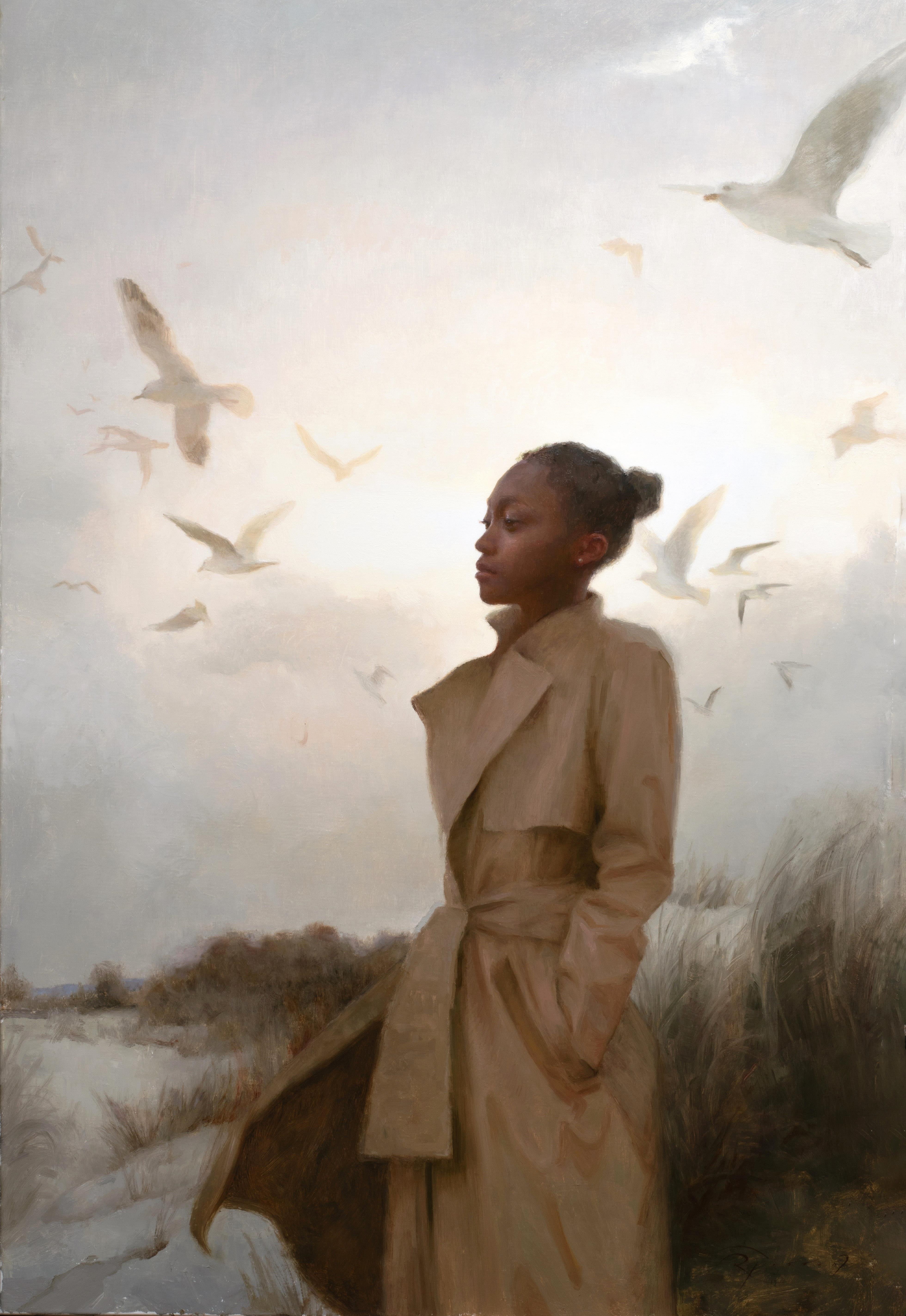 I loved the idea of painting a figure who was buffeted by circumstances, but poised enough to ignore them. The figure in Sentinel refuses to acknowledge the raucously circling seagulls, or the wind blowing her coat, or even the viewer themselves. She waits it all out patiently, eyes fixed on something we cannot see. The breaking light in the distance implies that the change she awaits is getting closer.