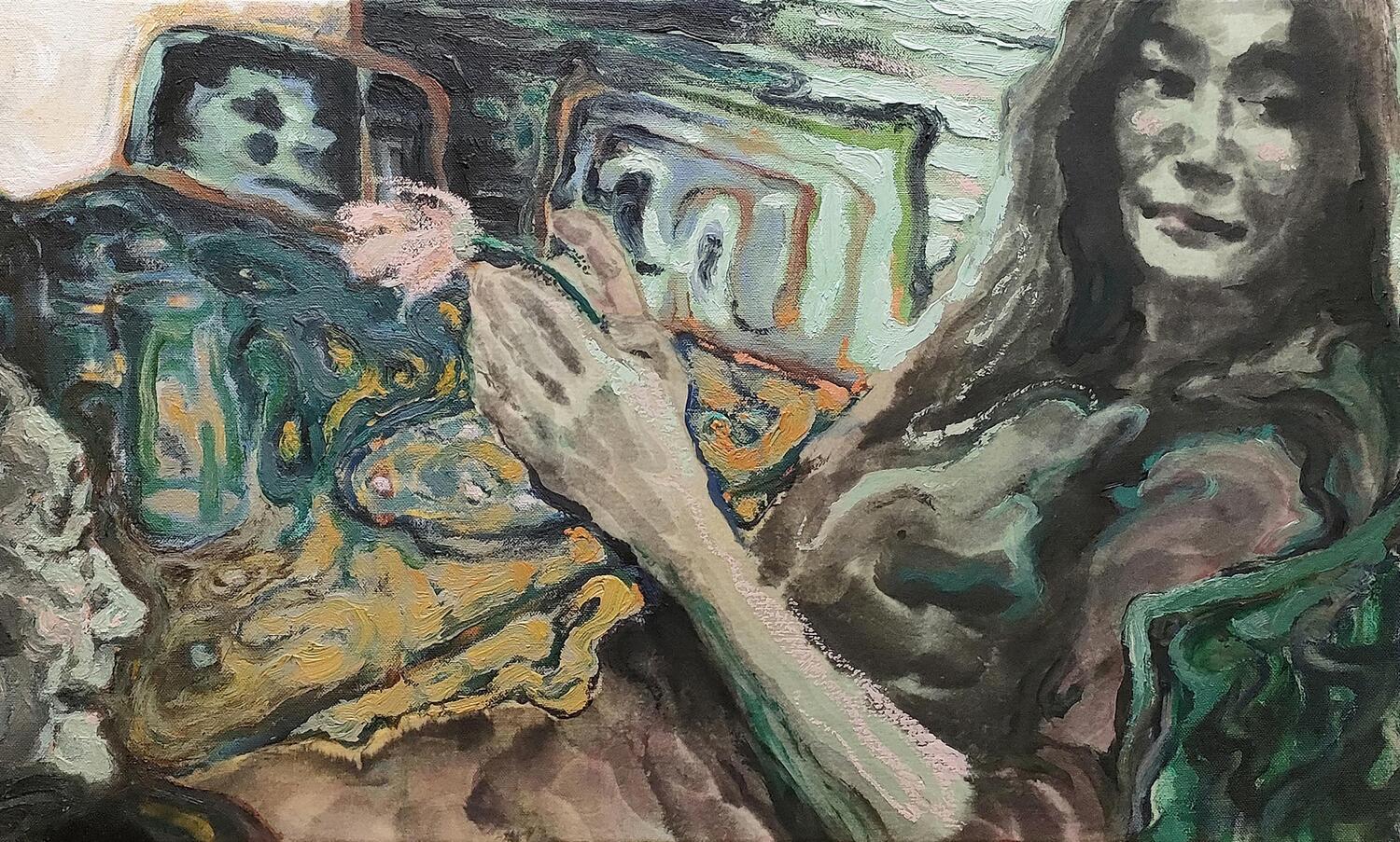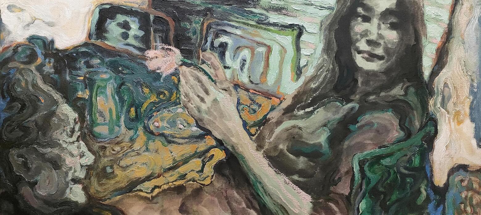 My work often begins with collecting images and information that reflect hotspots and social realities, drawn exclusively from Chinese social media, the Chinese search engine Baidu, or from personal recollections. These sources often capture moments of emotional or psychological tension or highlight topics I feel compelled to raise awareness about. This selective process allows me to engage with both collective and personal memory, grounding my work in a specific cultural and emotional context. In this particular piece, I started with a CCTV still that captured the strange feeling of seeing myself within the context of my grandparents' home. I used oil paint for the background and my grandpa, representing solidity and permanence, while rice paper serves to depict my figure—fragile and transient.