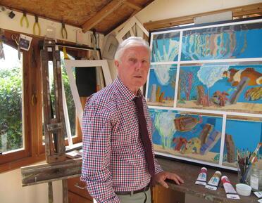 My painting in the show, Boarded Tower and Power Stations, Dungeness, reflects my work as a realist painter. My paintings evolve from drawings and close observation of places and locations often of an unusual or quirky nature. In this painting, therefore, the brooding presence of the huge power stations appears in stark contrast to the apparent fragility of the ancient boarded signal tower on the shingle banks at Dungeness.