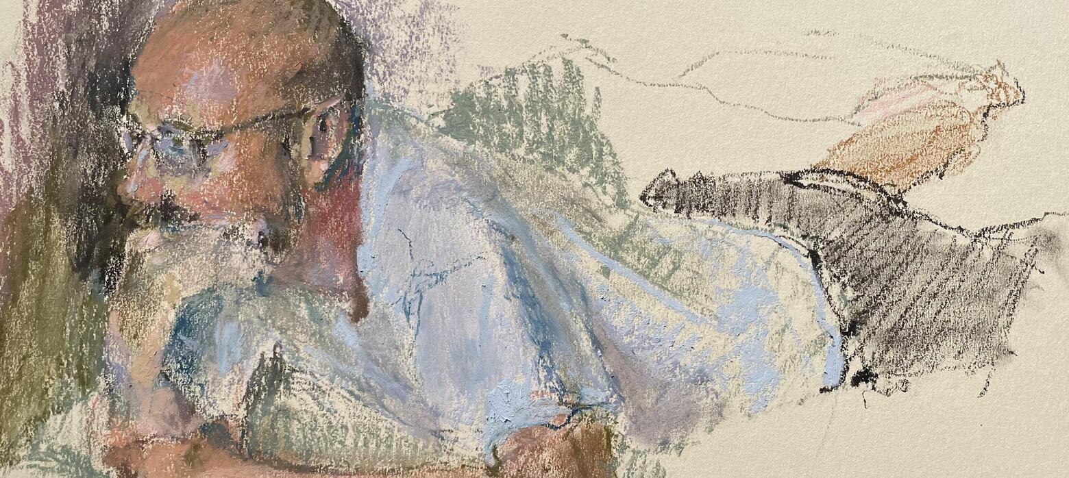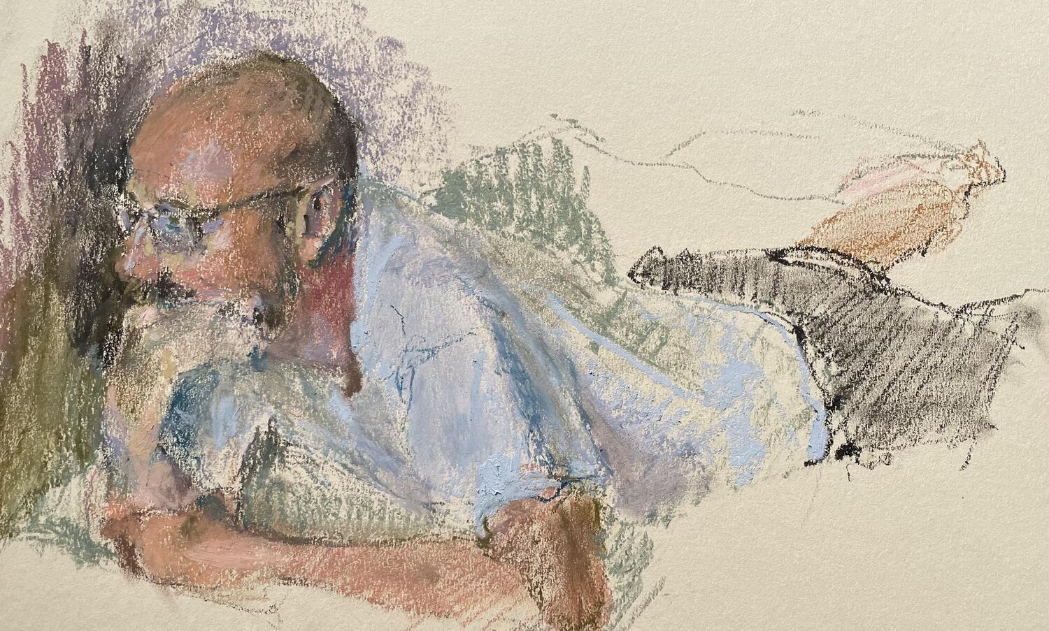 This is one of over 90 drawings I made in 2023 of my partner Nathan, a postman in the Scottish Borders. I don’t think many people really think about their postman beyond receiving their parcels and letters. It’s a physically demanding job and takes its toll over the years. I like to show the man behind the red shirt. He’s often exhausted after work but on this occasion he wasn’t. He’d worked a short shift one summer’s day. I had to work fast though, as it’s not a position he could hold for long. I used oil pastels which I'm relatively new to.