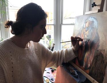 My piece represents a very common scene for artists. Sat at the easel, trying to solve a problem while painting. This piece was painted early this year during an artist residency. It was originally a self-portrait study to break an artist’s block, as I was having problems with a much larger painting I was working on. However, its unusual angles and forced perspective helped me change how I was looking at my work.