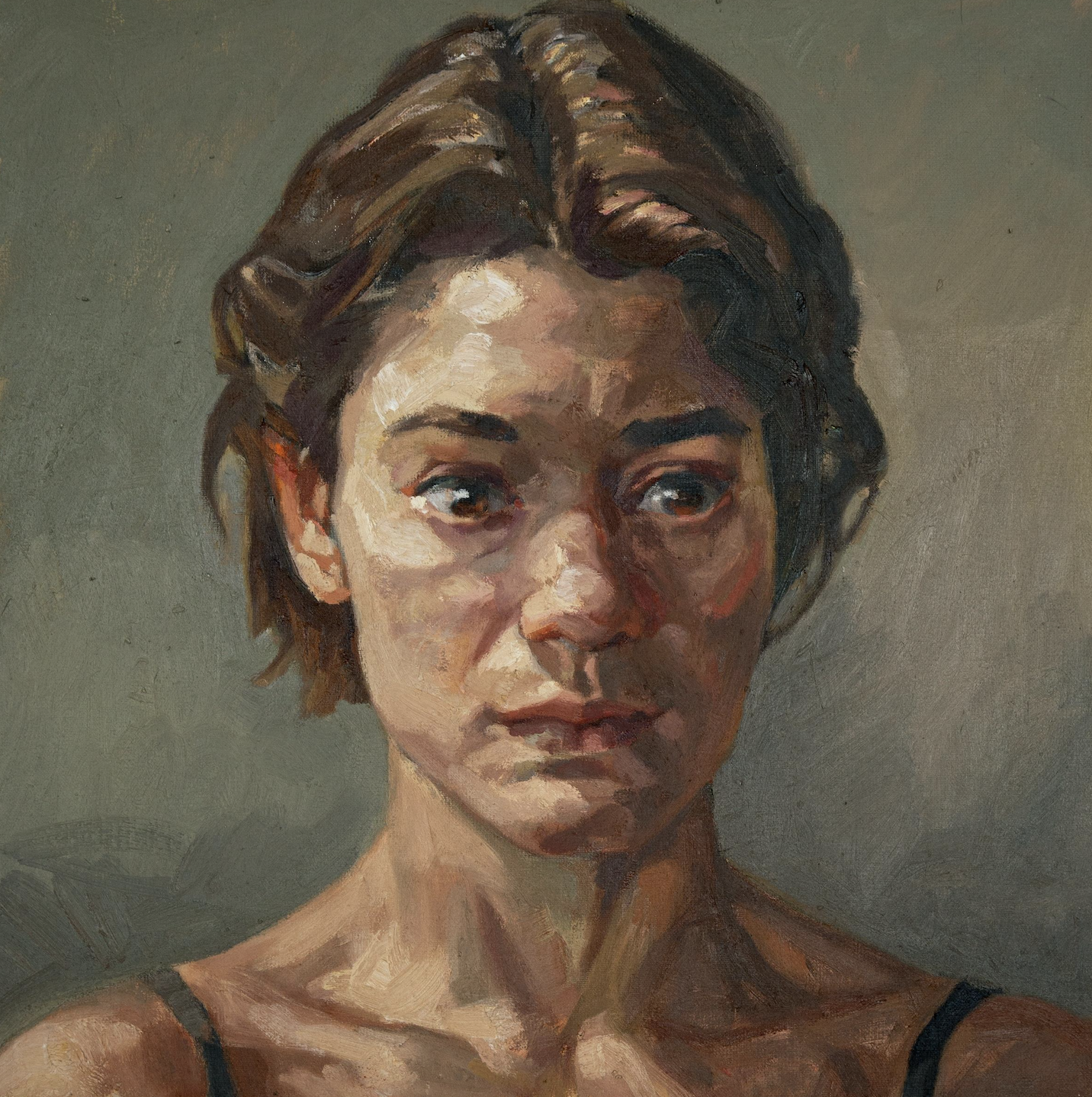 Elvan is a lovely girl from Turkey who lives in the Netherlands and with whom I work from time to time with my students. I decided to paint her myself because she has striking features, powerful eyes and jawline but at the same time a beautiful shyness around her. She is very modest in her beauty. It is that combination of softness in her atmosphere and outspokenness in her shape that attracts me artistically.