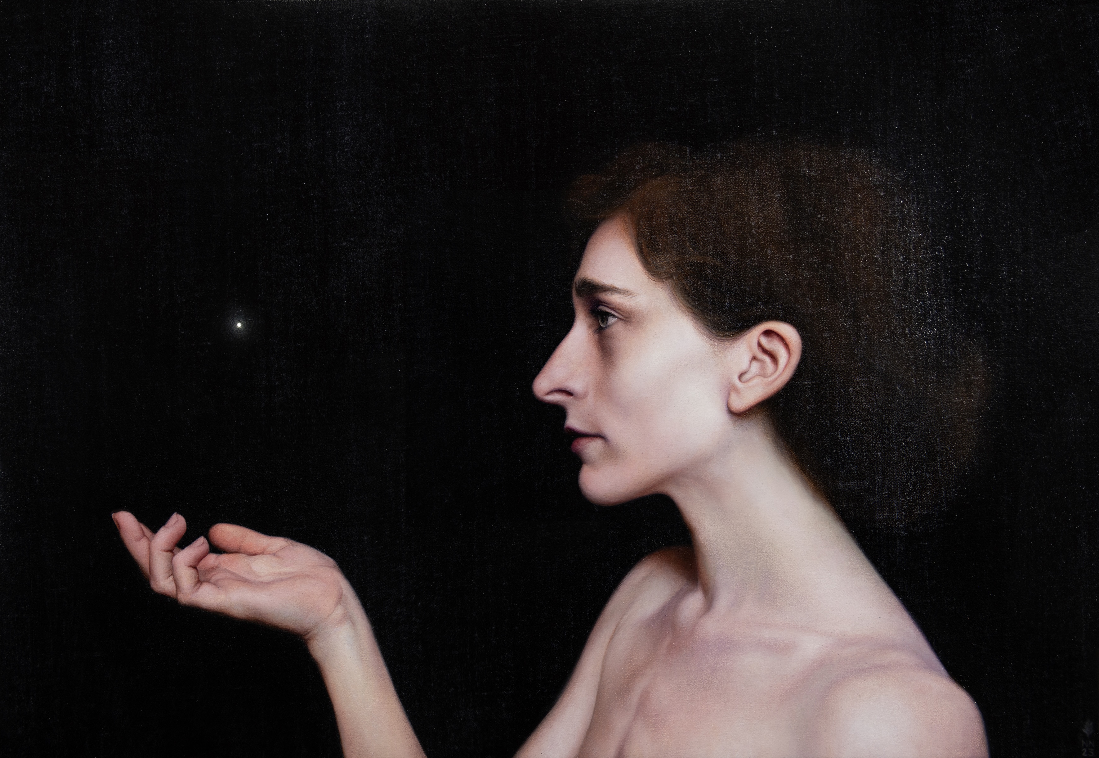 Nathalie Nahai’s portraiture is also executed in an alluring hyperrealist style but with a greater leaning towards simplicity and, perhaps, stillness. In 'Light in the Well of Shadows', the viewer is lured by an image of a striking young woman positioned in profile against a featureless black background. The woman’s hand is gently raised and, suspended inches above it, floats a tiny ball of light – an intriguing scene which draws us, the viewer, like a moth towards the small light. The sitter’s dewy skin glows against the seemingly cavernous darkness. Emptied of compositional clues, the piece adopts a philosophical tone reflective of both the sitter’s gentle curiosity and, perhaps, Nathalie’s own probing mind (alongside her visual art, Nathalie is an author, musician and keynote speaker whose work focuses on AI, human behaviour and ethics).