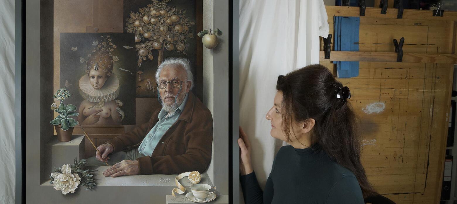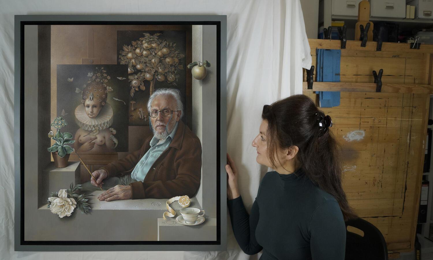 1. Miriam Escofet RP with the portrait of her father titled 'What will survive us...', mixed media on linen over panel, 90cm x 80cm