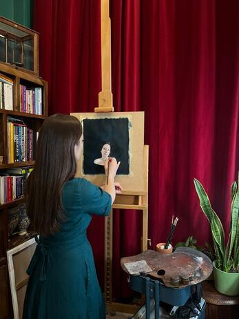 This emphasis on the importance of a person’s individuality brings us to the topic of technology. Although both are reliant on some digital tools to create their work – ‘As well as drawing from life during sittings, I take a lot of good reference photos and then edit those on my computer’ says Miriam – they are sceptical of the growing role of AI. ‘It ends up creating perfect but generic images’, argues Miriam, ‘I think we’re going to become swamped by AI imagery in the art world, and, well, there is already a market for that. I think it will have an impact, then I think there’ll be an aesthetic rebellion against it [...] what we might find is that artists try to find another language that signifies, I’m not a machine, I’m a human, and this is how a human paints. It might change our language as artists down the line.’ She raises a pertinent question: in a landscape saturated with imagery created through artificial means, might the rarity of the artist’s hand hold even greater value?