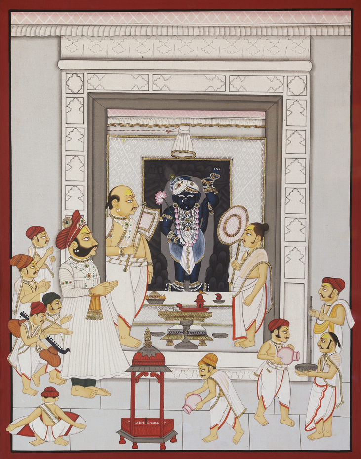 The term 'Pichvai' derives from the Sanskrit words 'pichh' (back) and 'wai' (hanging), reflecting its purpose as a backdrop for the idol. These artworks had both ritualistic and commercial significance; large paintings were hung behind the idol within the temple as part of the seasonal adornment, while smaller versions were sold to pilgrims as sacred mementoes. These paintings served as visual relics, allowing devotees to carry an image of their deity back home, reinforcing their spiritual connection beyond the temple walls.