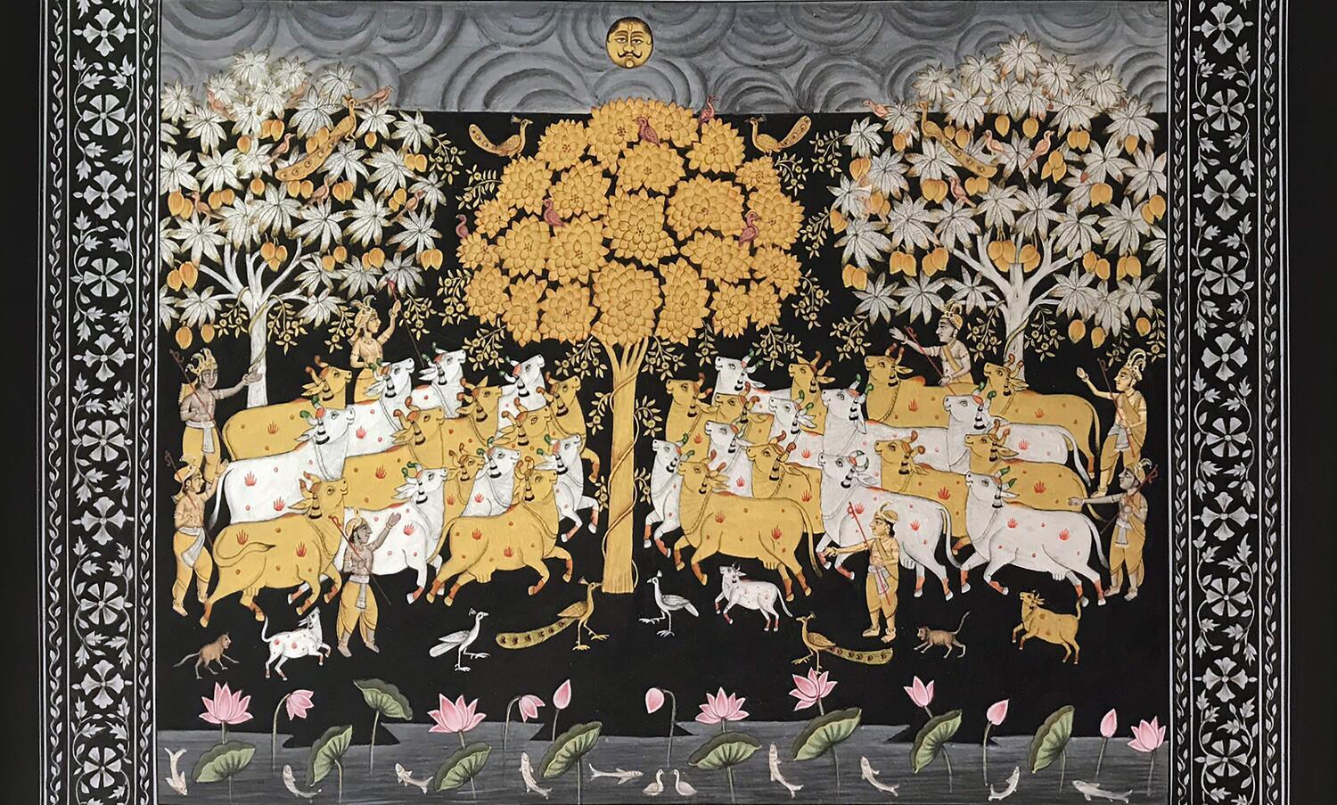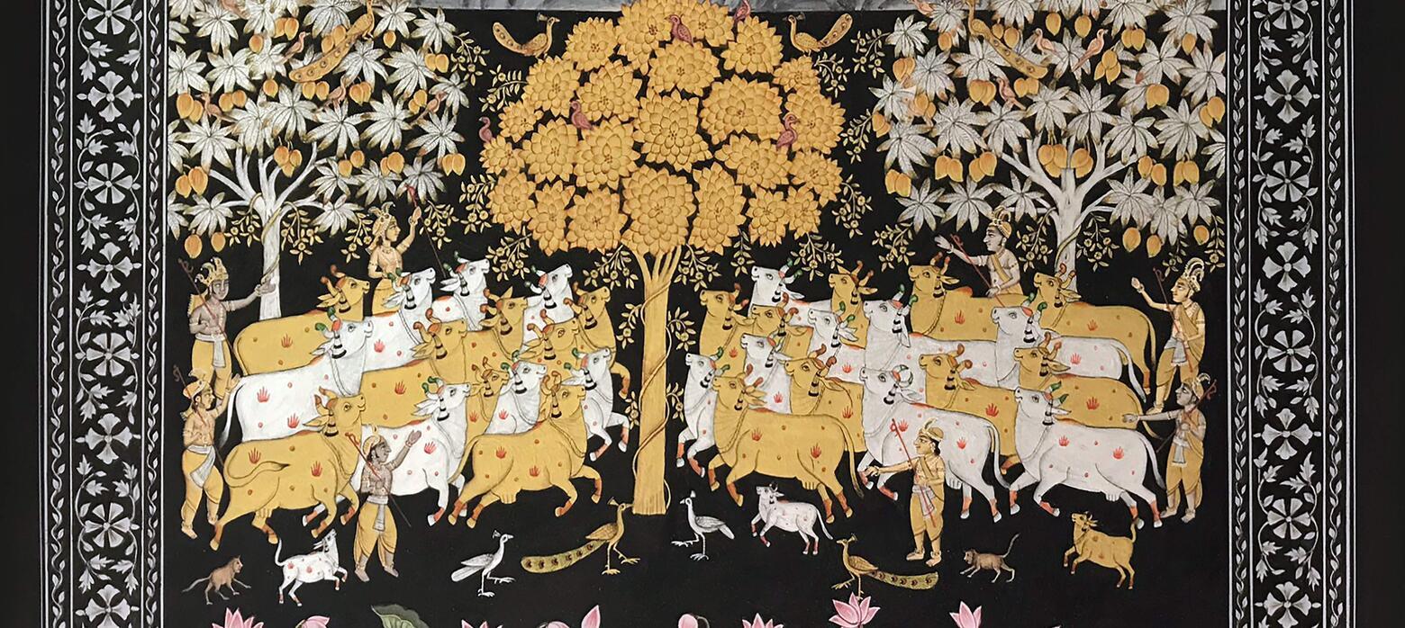 A Pichvai is a detailed, hand-painted textile originating in Rajasthan, traditionally hung behind the idol of Shrinathji, a cherubic incarnation of the Indian deity Lord Krishna. The main shrine to Lord Krishna can be found in the temple town of Nathdwara in Udaipur, which has been a site of pilgrimage for centuries.