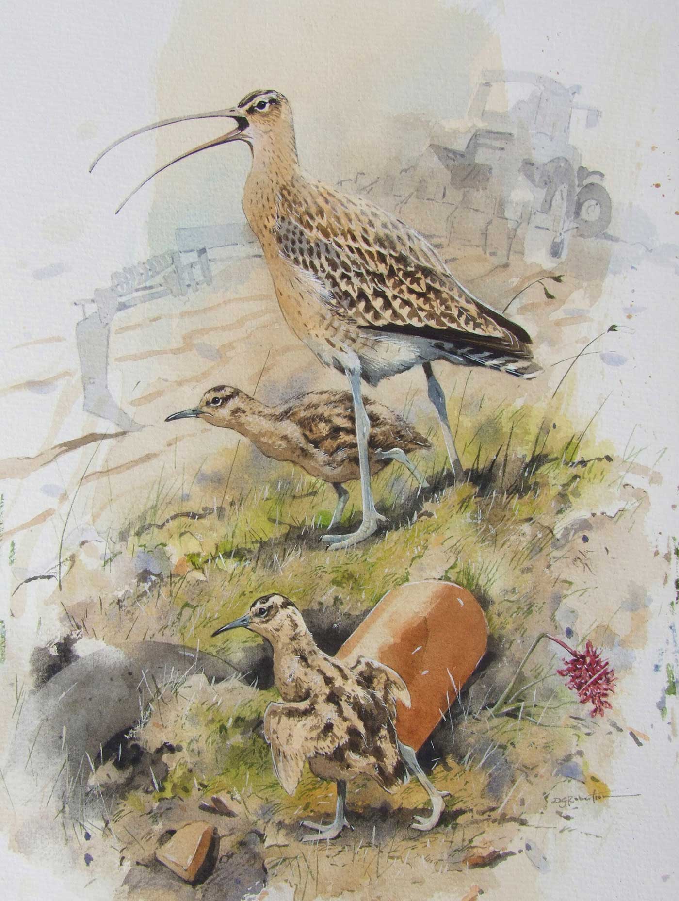 "From my project, Testaments of Loss, which documents the small scale incidents of environmental loss I have noted over my last 35 years as a wildlife artist. Modern technology of spring-suspension ploughs have allowed rough and uneven upland areas to be ploughed and re-seeded, turning semi-natural meadows into grass monocultures and destroying the habitat of waders such as the endangered Curlew." - Derek Robertson