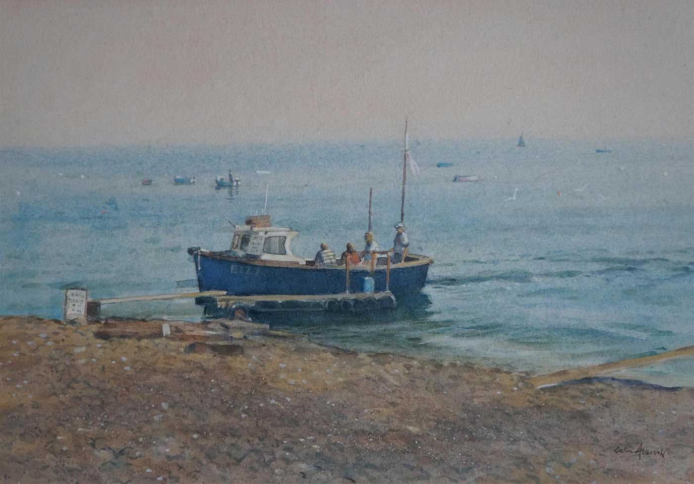 Colin Allbrook’s painting Returning At The End Of The Day depicts a group of people in their small boat as it comes into the old pontoon after a few hours out at sea, perhaps after enjoying some sightseeing or mackerel fishing. The setting sun after a hot day creates a rosy glow in the sky with a slight haze over the still sea giving an overall calming atmosphere to the piece, with a sleepy sense created mirroring how the people in the boat probably feel after their day out at sea.