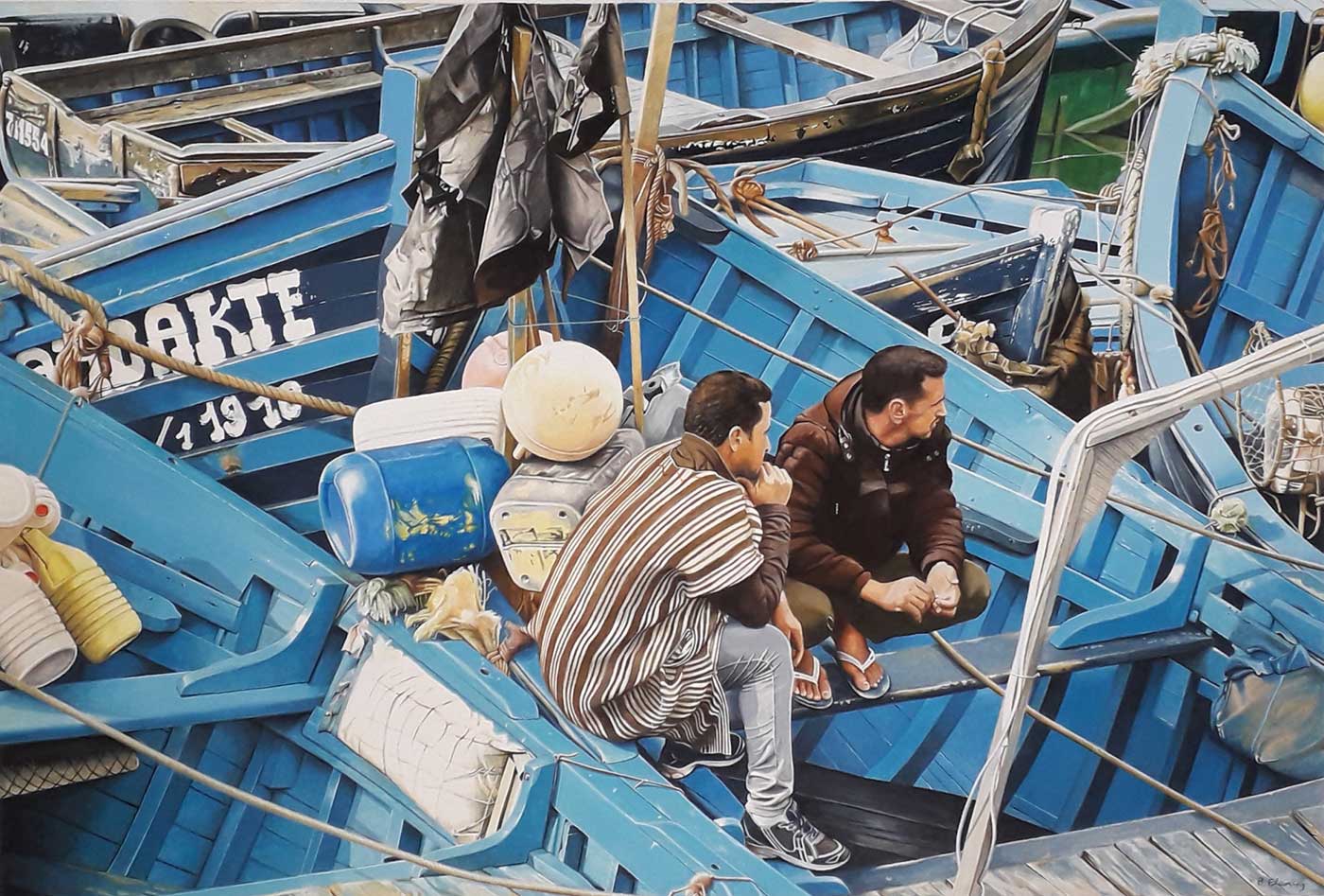 The final painting to highlight is Two Men, Essaouira Morocco by Brian Fleming. Brian explains: ‘I was particularly interested in these two men sitting quietly in their boat as they were surrounded by the noise and activity of the port. There are so many boats that they seem to fit together like a jigsaw puzzle. The boats were full of a chaos of equipment.’ The chaos is contrasted by the peaceful men as they sit contemplatively whilst perched on the bench of the boat.
