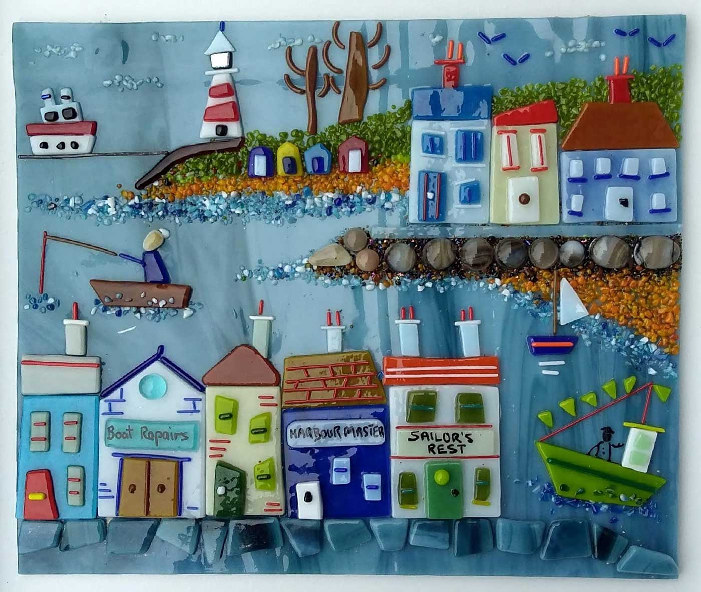 Bren Keyte creates glass pictures. In this image Sailor’s Rest we can see a fisherman as well as another person sailing their boat set in the scene of a harbour with a lighthouse, beach huts and harbour buildings. Bren explains: ‘Lots of detail was obtained by cutting very small pieces of Bullseye glass, collaging them onto a piece of streaky base glass, then firing it in a kiln at 730 degrees centigrade.’ The variety of textures, particularly in the sand and at the edge of the sea really add to the atmosphere of the piece, bringing it to life.