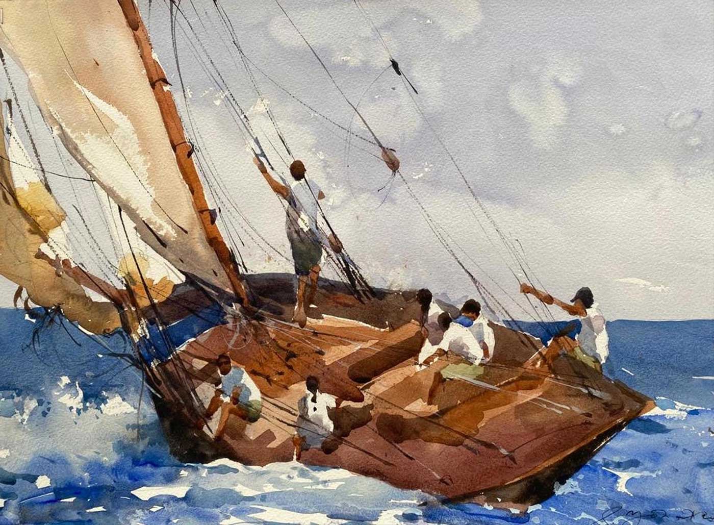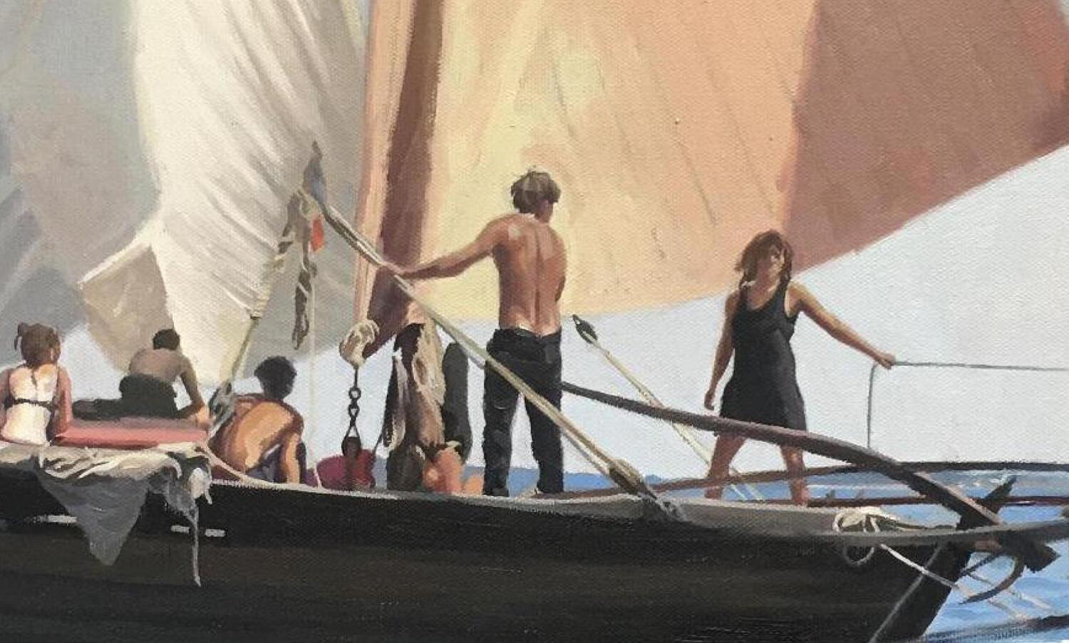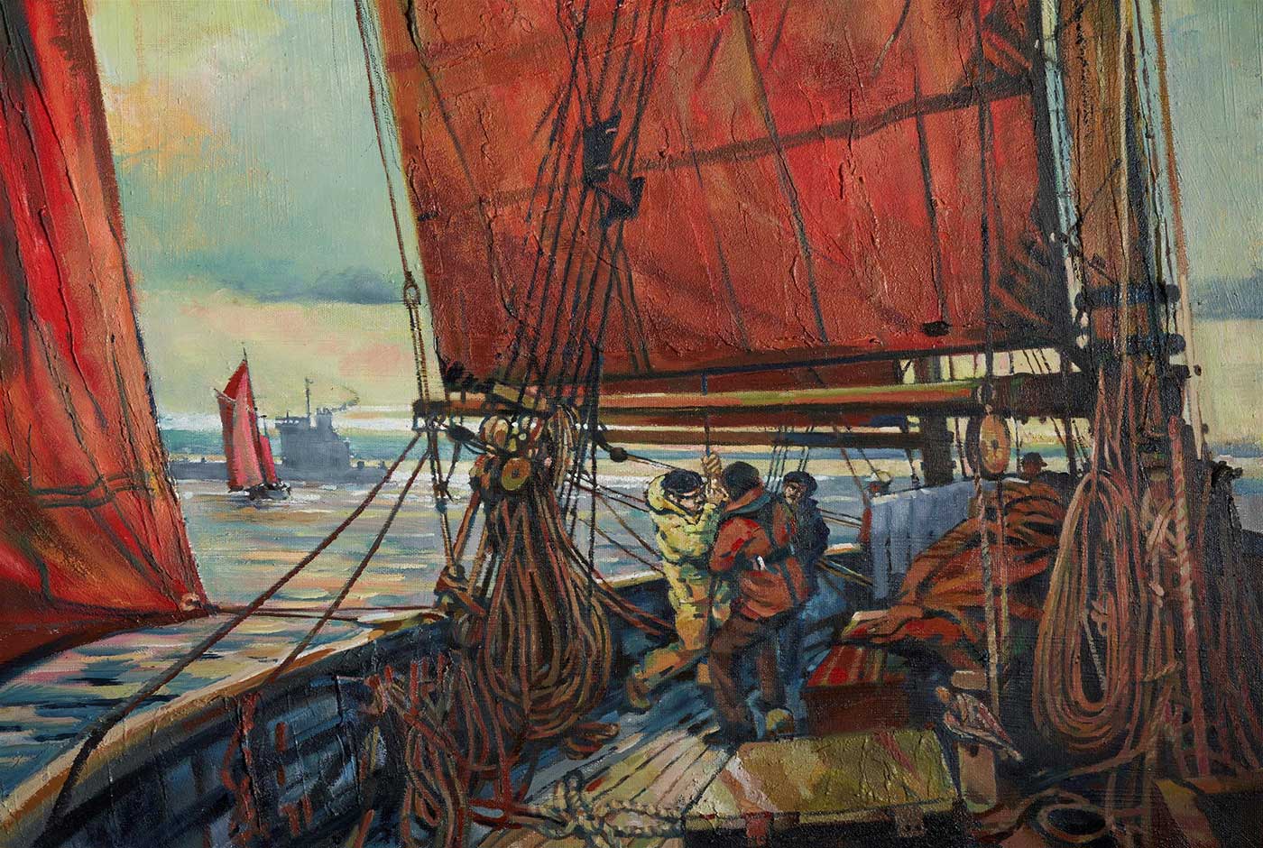 John Scott-Martin’s painting Crossing the Channel at Dusk shows a group of sailors hoisting the main topsail on board the Brixham Trawler 'Provident'. John explains they are preparing for a night of sailing on the English Channel on their way home from Brittany, France, with the pinks and oranges of the setting sun reflected in the sea. John has really captured the strength of the sailors needed to hoist the sail reflected in the way the figures are positioned.