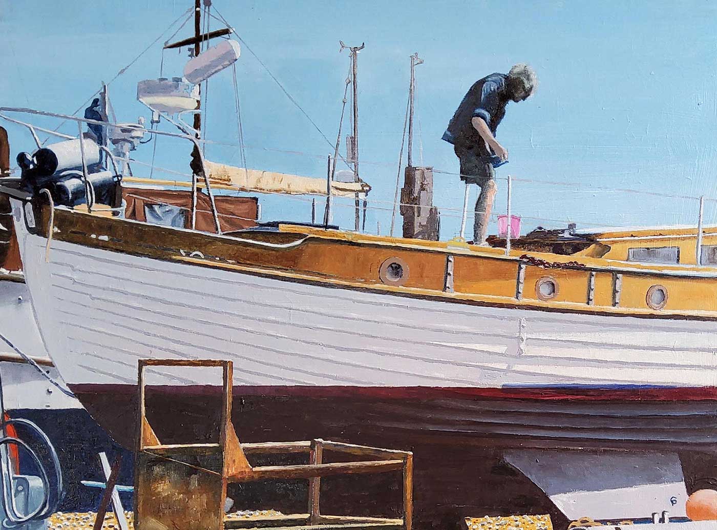 Getting on Top of It by Chris Pitman is a painting of a man at work on his boat as it is moored in a boatyard, as he works on maintenance, against the backdrop of a clear bright blue sky. Chris describes the painting as a reflection of ‘a labour of love on the hottest day of the year.’