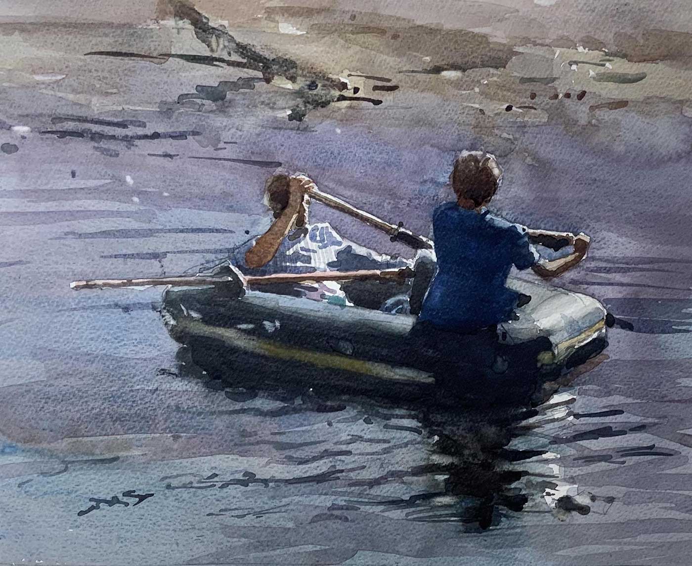 David Thomas’ painting Dinghy captures two figures manoeuvring a dinghy boat near the shoreline, the large oars compared to the tiny boat suggest it might have been quite a challenge to steer! David explains he was compelled to capture the scene as he was drawn to the light on the figures and on the water.