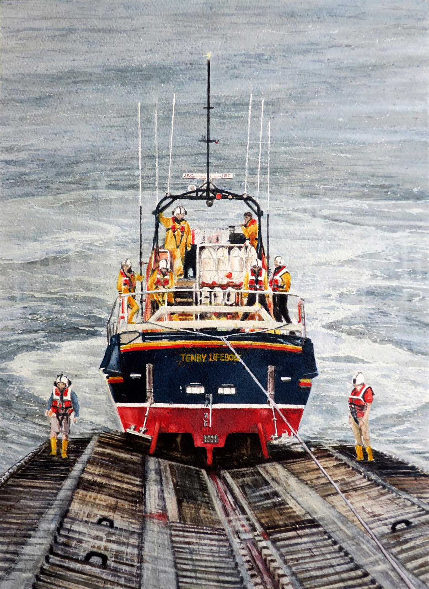 Deborah Walker’s painting Job Done shows a lifeboat coming in at Tenby, in Pembrokeshire, Wales, which is one of over 200 lifeboat stations around the coast in the UK. Deborah explains: ‘It's a special experience to watch a lifeboat go out or come in. I had no idea where they had been, but as they manoeuvred into position for the long haul up the ramp, their job was done.’