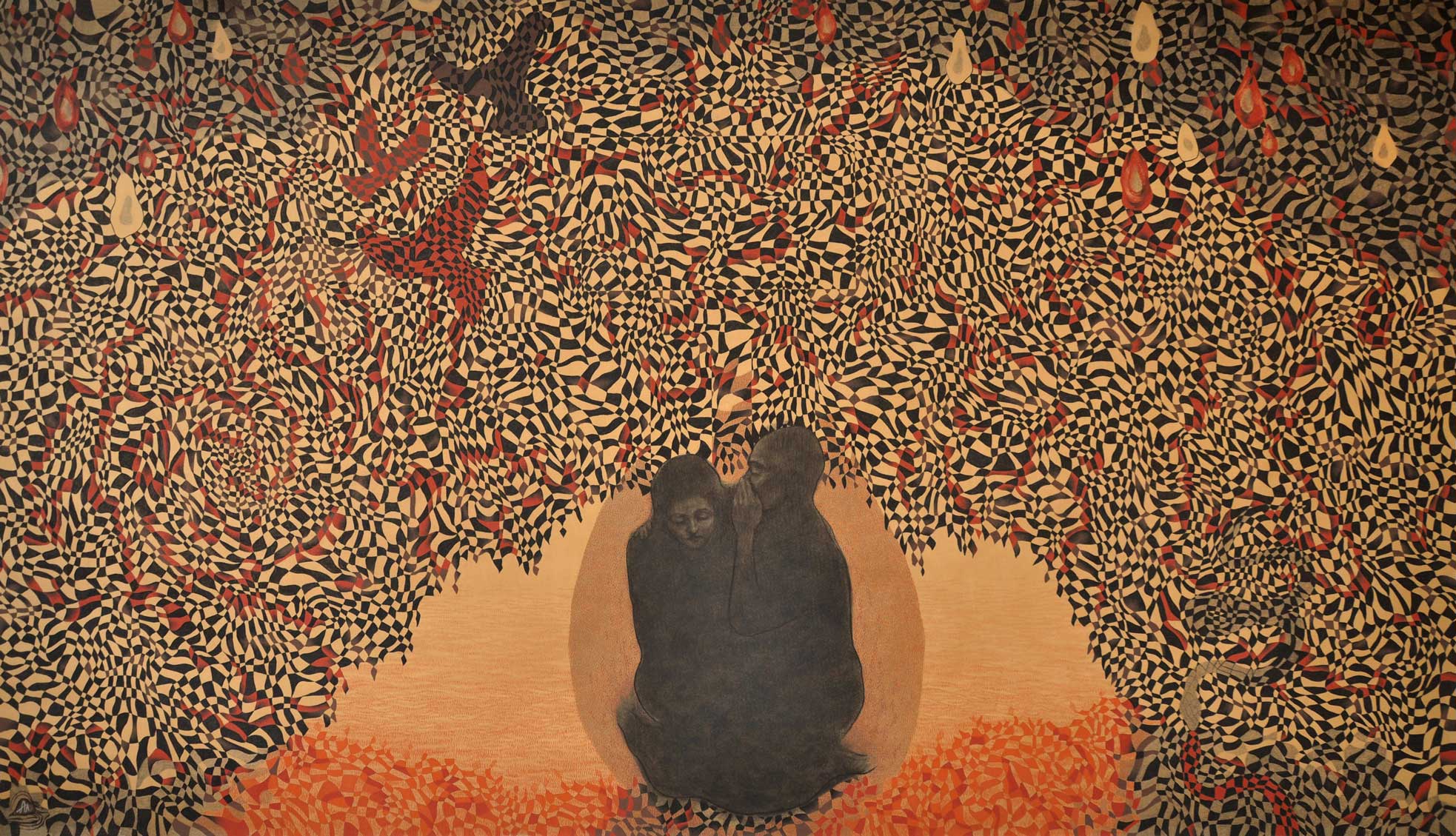 For this exhibition, I’ve created a body of works executed mostly in charcoal and sanguine on paper. They range in size and in the topics they tackle – from online privacy to Christian mythology, romantic love to our relationship with the natural world. But the meanings they hold for me don’t really matter. I encourage visitors to dream before the images, to swim in the feelings they evoke or find their own meanings. And that can most effectively be done by experiencing the work physically. So I urge people to come along to the show!