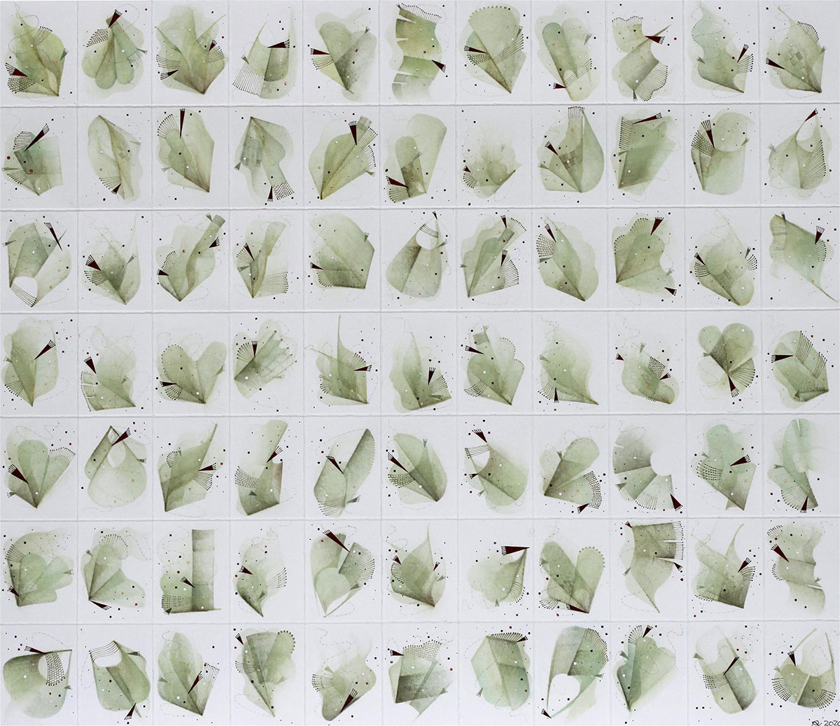 During the first lockdown in 2020, I started drawing new leaves of Jasmine, inspired by the view from my garden studio. I always try a lot of small sketches first and then place them in a grid structure, which became, in this case, “Green Stylus”.