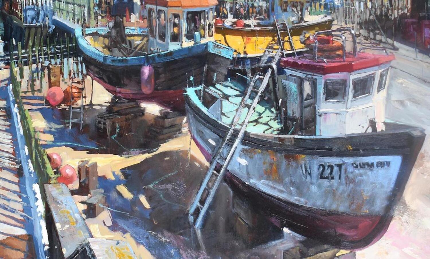 Alistair Butt RSMA Busy at Whitby Fish Dock Oil, 25 x 35 cm