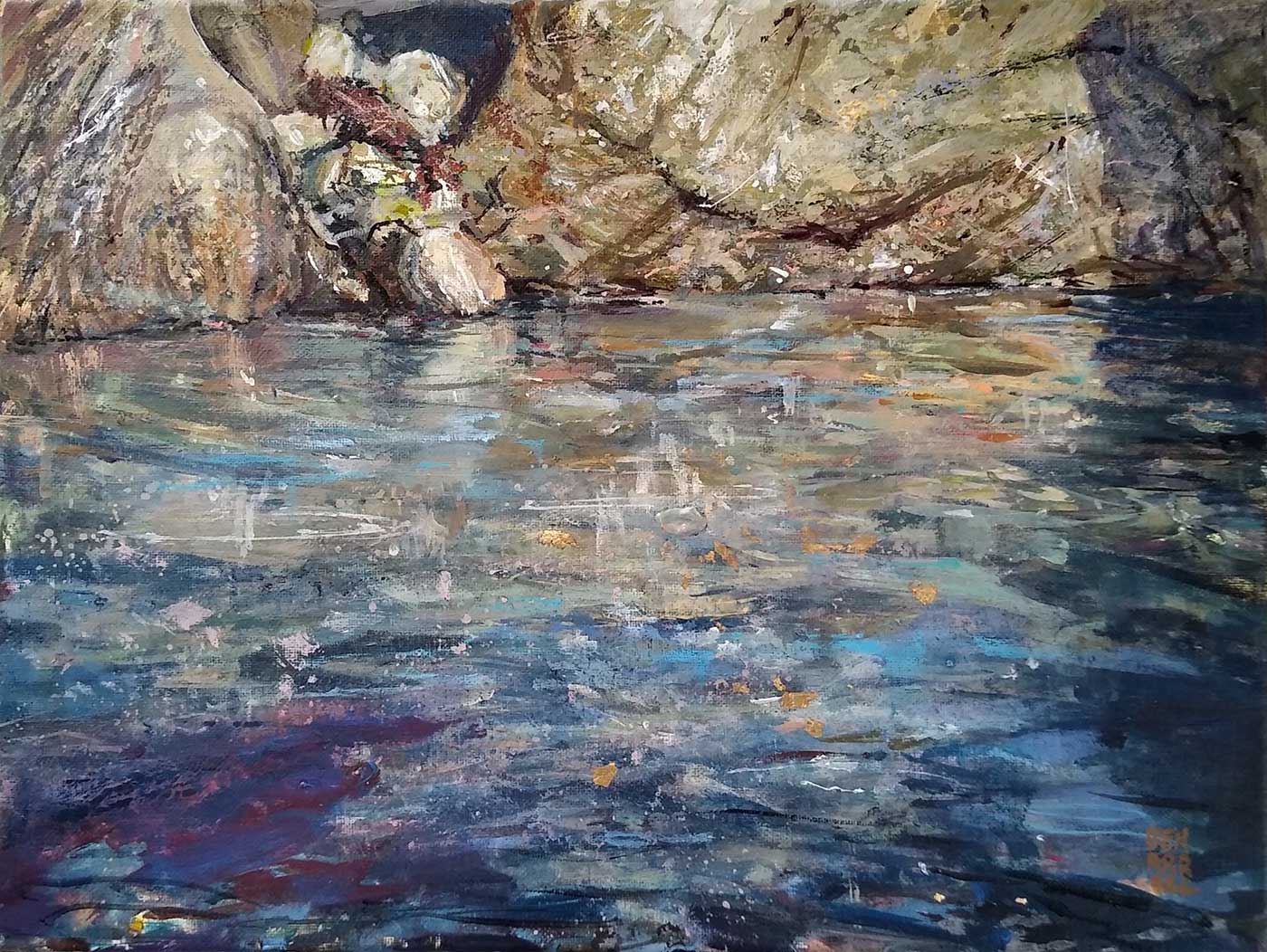 All That Glistens by Sophie Beharrell is an acrylic painting with flecks of gold leaf, that has been used to really enhance the way that the light hits the water. Sophie explains: ‘Rock pools are the things I love to paint the most. This is an afternoon light where the barnacles and their reflections glistened in golden light.’ The pale reflections of the rocks in the pool slowly blend into a deep blue at the forefront of the painting, adding depth to the piece.