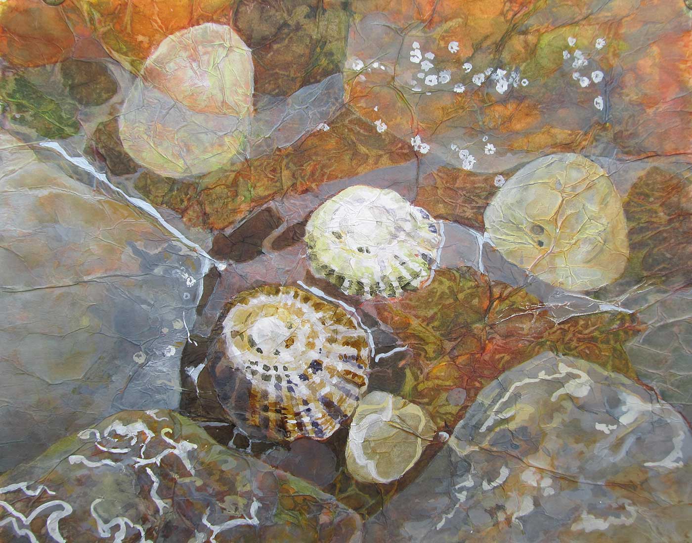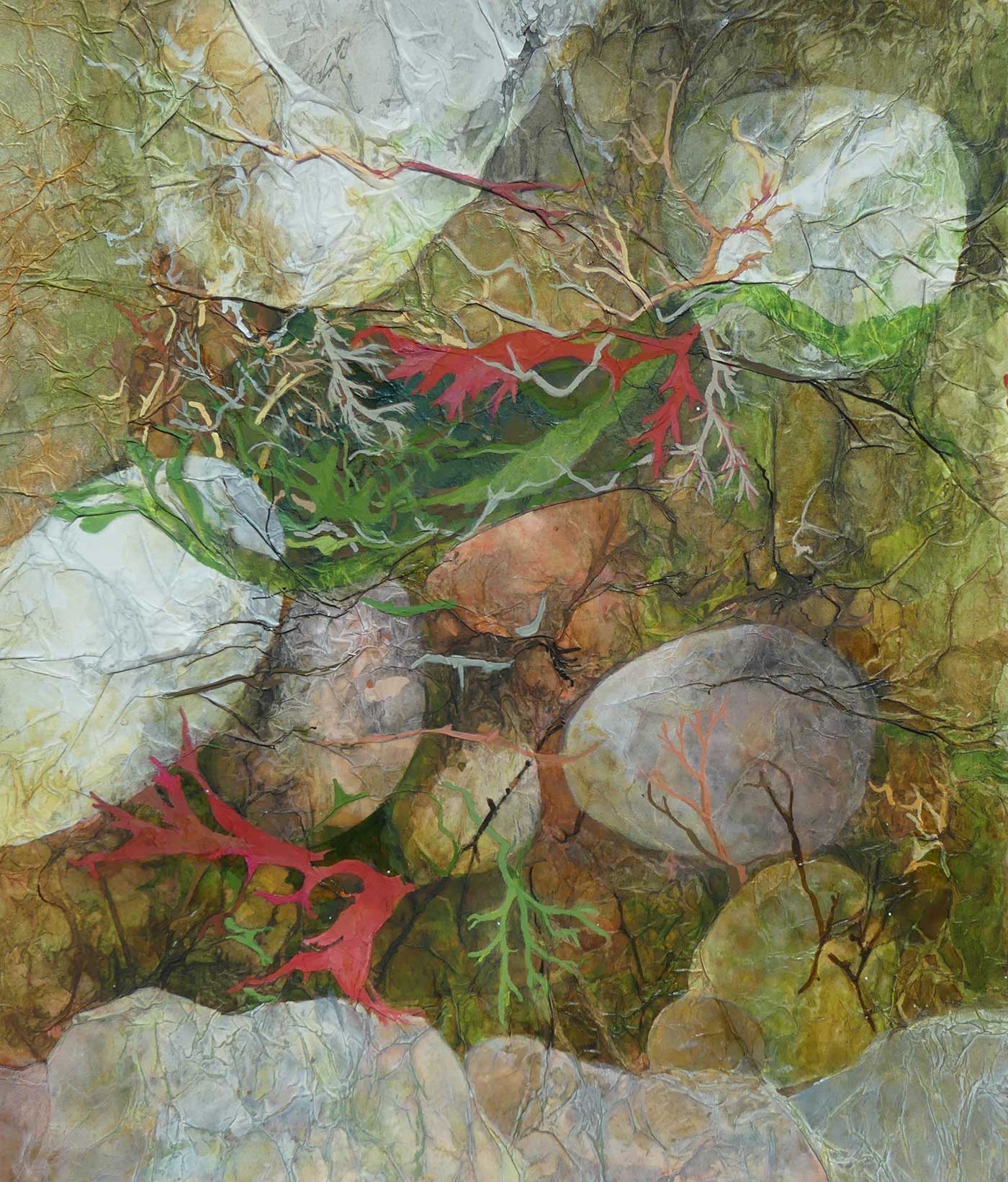 Rita Dee’s Tidal Rhythms also features within the exhibition and was made with the same technique, working with acrylics, inks and gouache on top of a textured surface made from crumpled tissue paper. This piece suggests the soft ripples within a rockpool, transparency of the seawater, and light sometimes catching the surface’s movement. Rita developed the piece by working from drawings, shells and stones that she collected.