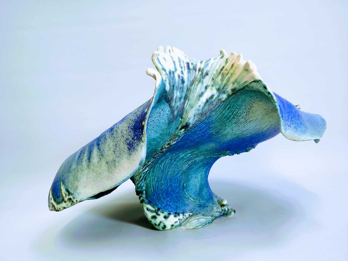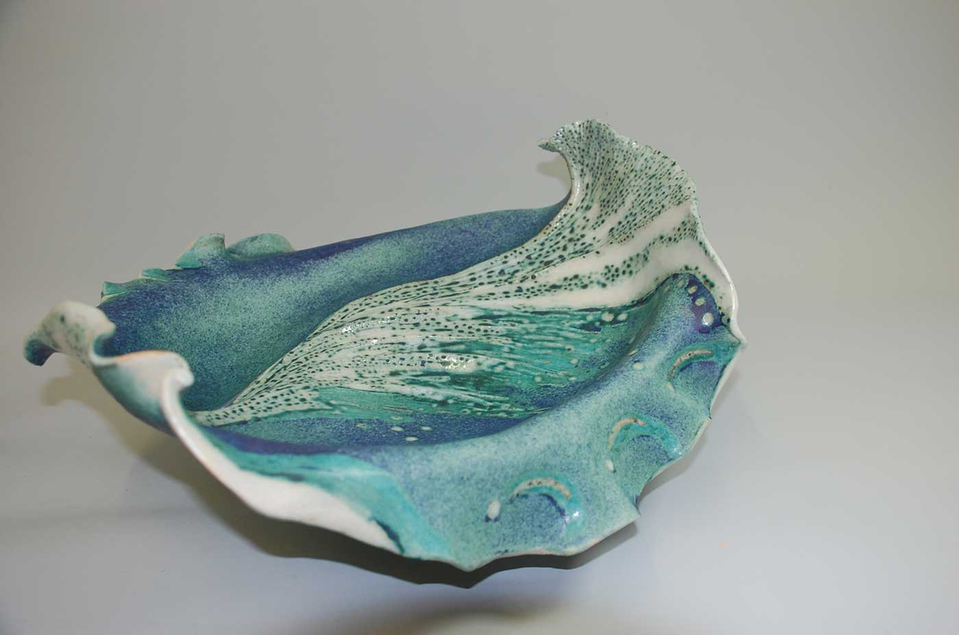 Through her ceramics, Valerie captures the movement of the waves. Storm Surge conveys the power and motion of a stormy sea whilst ‘Swell’ conveys a more gentle wave. Valerie explains Storm Surge as follows: ‘A wave crashes down on the one side and rises to a crest on the other. The intention is to lead the viewer to see beyond the image in front of them and imagine the future form created by the force and movement portrayed.’