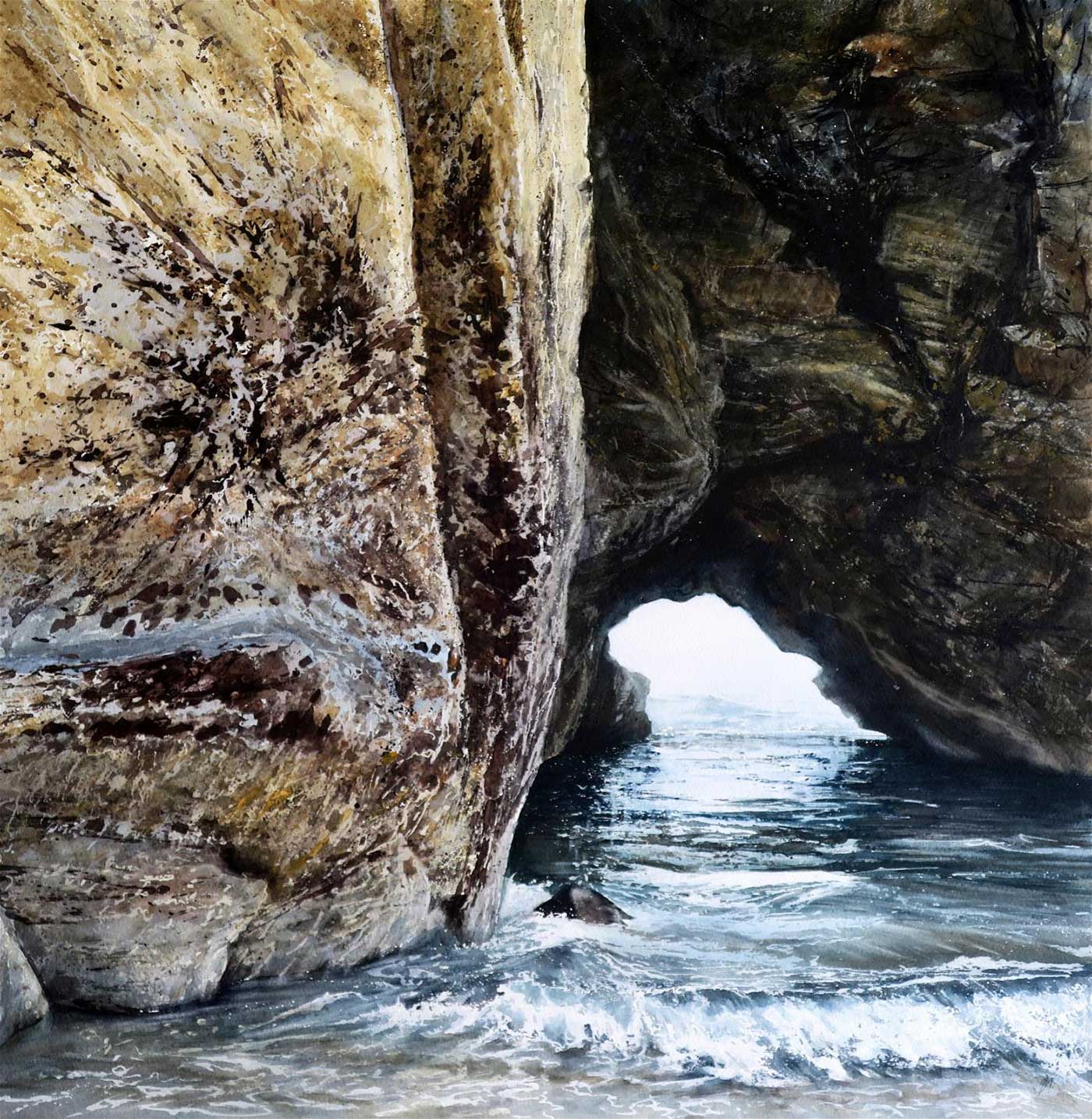 The last piece to highlight is Deborah Walker’s watercolour painting Flux. Deborah explains: ‘Flux describes something that is constantly changing, the process of flowing, or flowing out. The tide, rising and falling, in and out of the tunnel, creates a state of flux which becomes hypnotic.’ In Deborah’s work, she looks at both the dramatic and subtle ways that light transforms a subject, and a recurring theme for her is the depiction of water as she feels it provides a consistent challenge. Working in watercolour paints she embraces both representational and abstract elements, pushing the character of the paint to extremes.