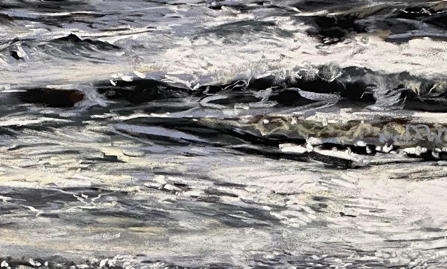 James Bartholomew’s watercolour and pastel piece Porthchapel Rocks depicts the waves crashing against the rocks on Porthchapel beach in West Cornwall. James takes great inspiration from the coastline and enjoys traveling around the British Isles to gather material to paint. There is a lot of movement within James’ work, with rhythmic and textured mark-making techniques used across the surface of the waves, which really accurately reflects the liveliness of the sea.