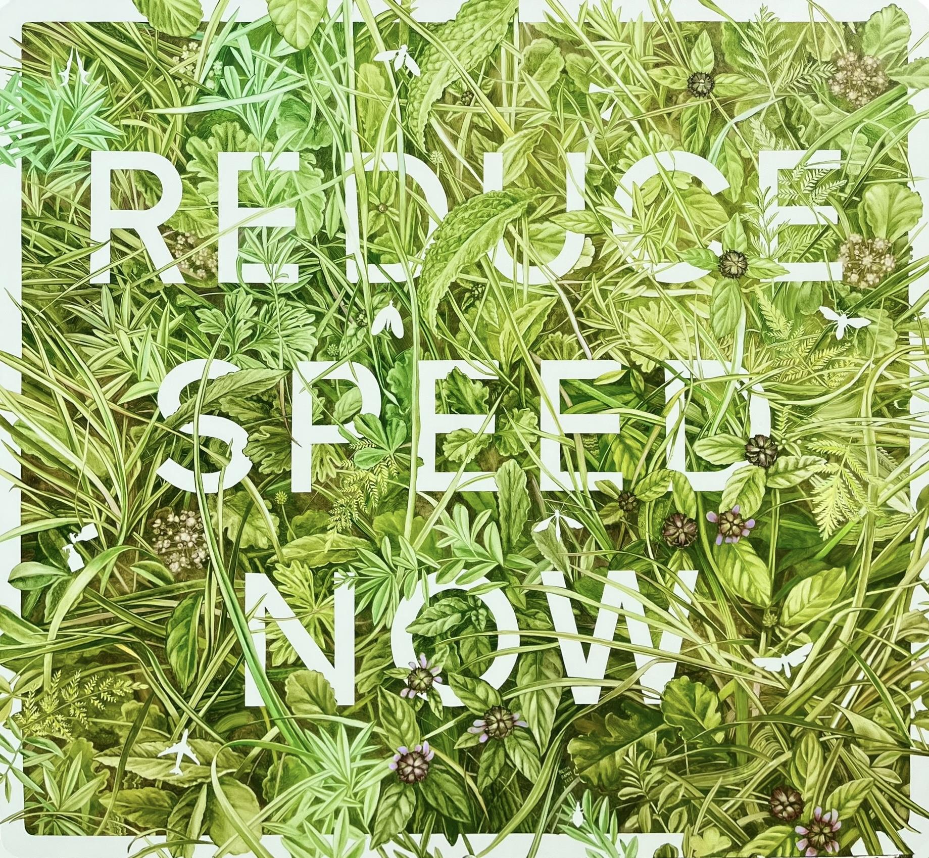 The plants are growing over and through the letters on the sign, like they do when you leave something on the ground for too long. They are beginning to reclaim them. ‘Reduce Speed Now’ is a familiar instruction on the roadside, but removed from that context the phrase has come to express my deep concern for the environment. Silhouettes of invertebrates are included, as well as some of the many threats they face.